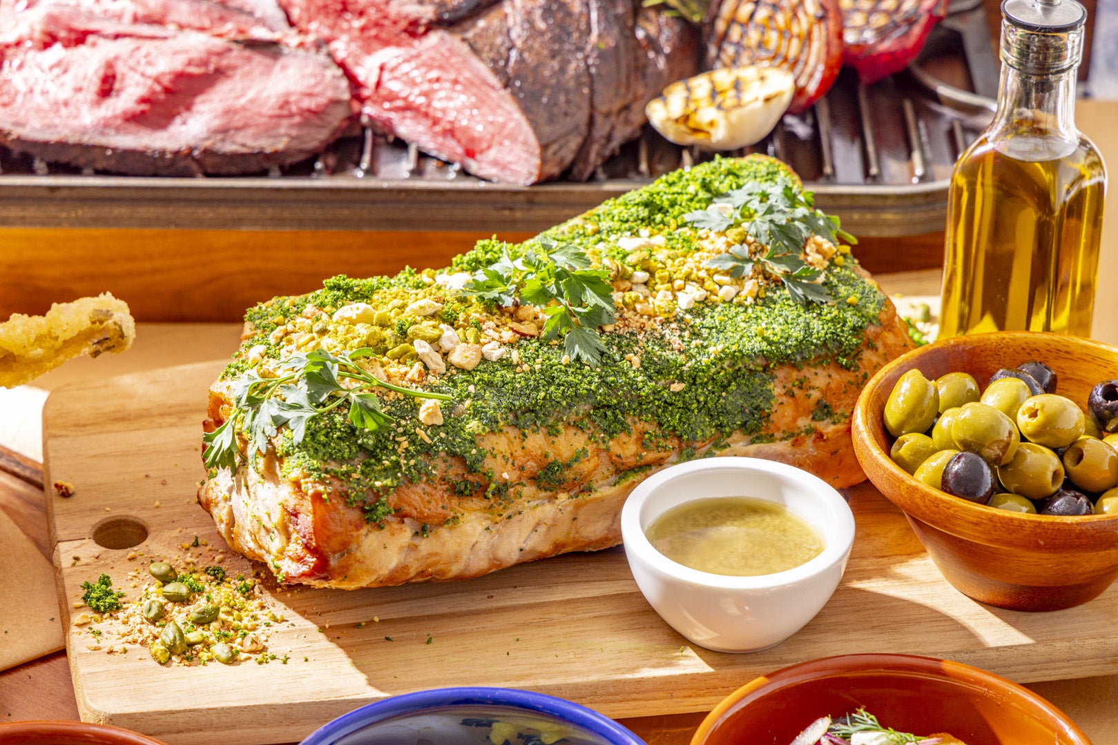 厳選した豚ロース肉をナッツとハーブでコーティングして丸ごと豪快に焼き上げました。ニンニクの効いたアンチョビソースと共に。