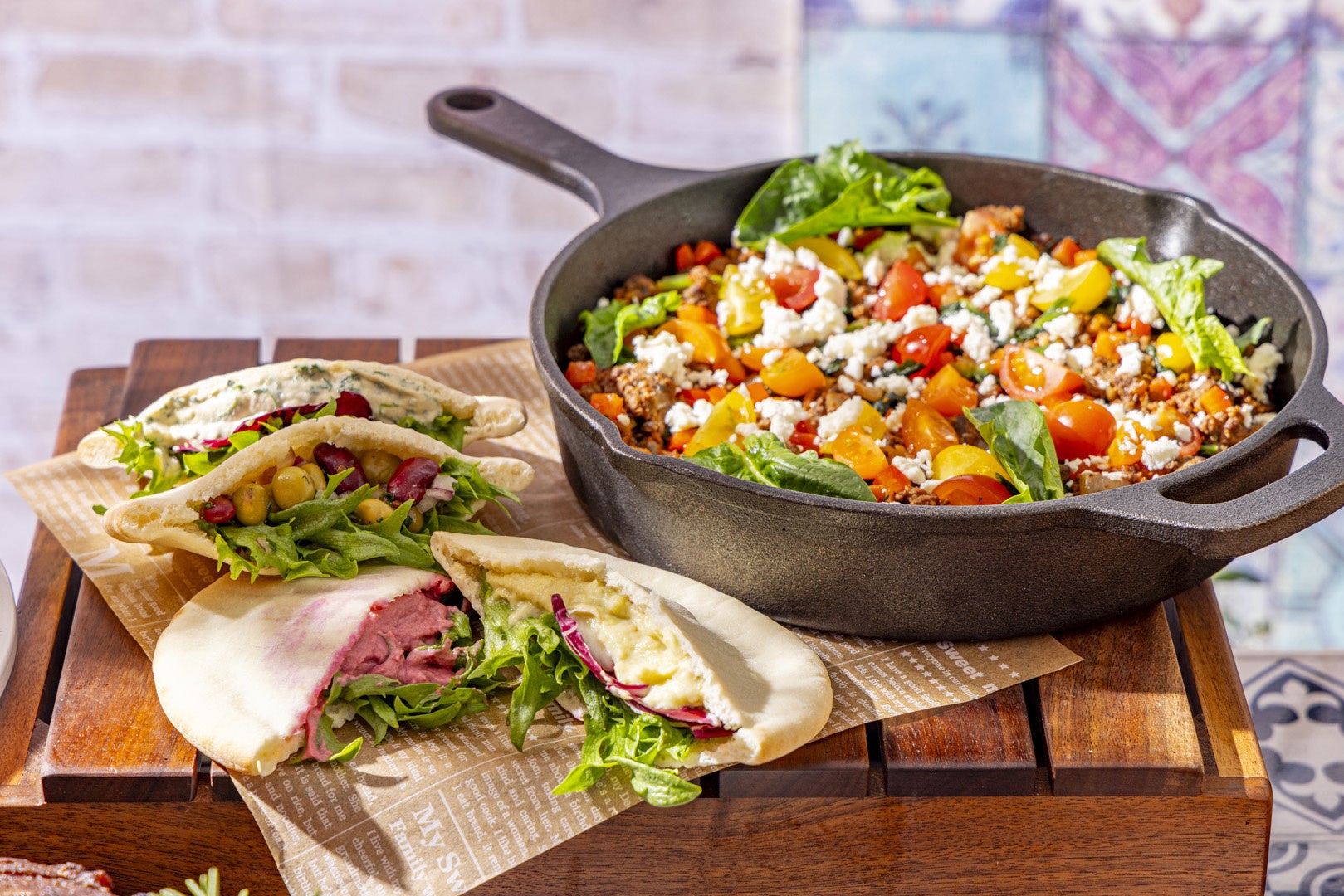 「牛ミンチの地中海風ソテー」や「フムス」、ナスとゴマを使用したディップ「ババガヌーシュ」などで自分好みのピタサンドに。