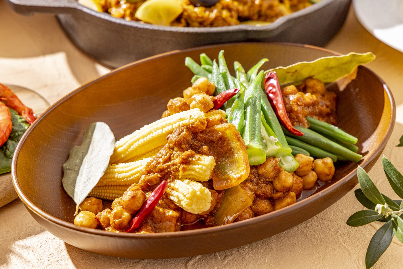 焼き上げたヤングコーンやインゲンなどの夏野菜とひよこ豆に、ピリッと辛いカイエンペッパーなど香り豊かなスパイスがたっぷりのモロッコ伝統のヴィーガン料理。