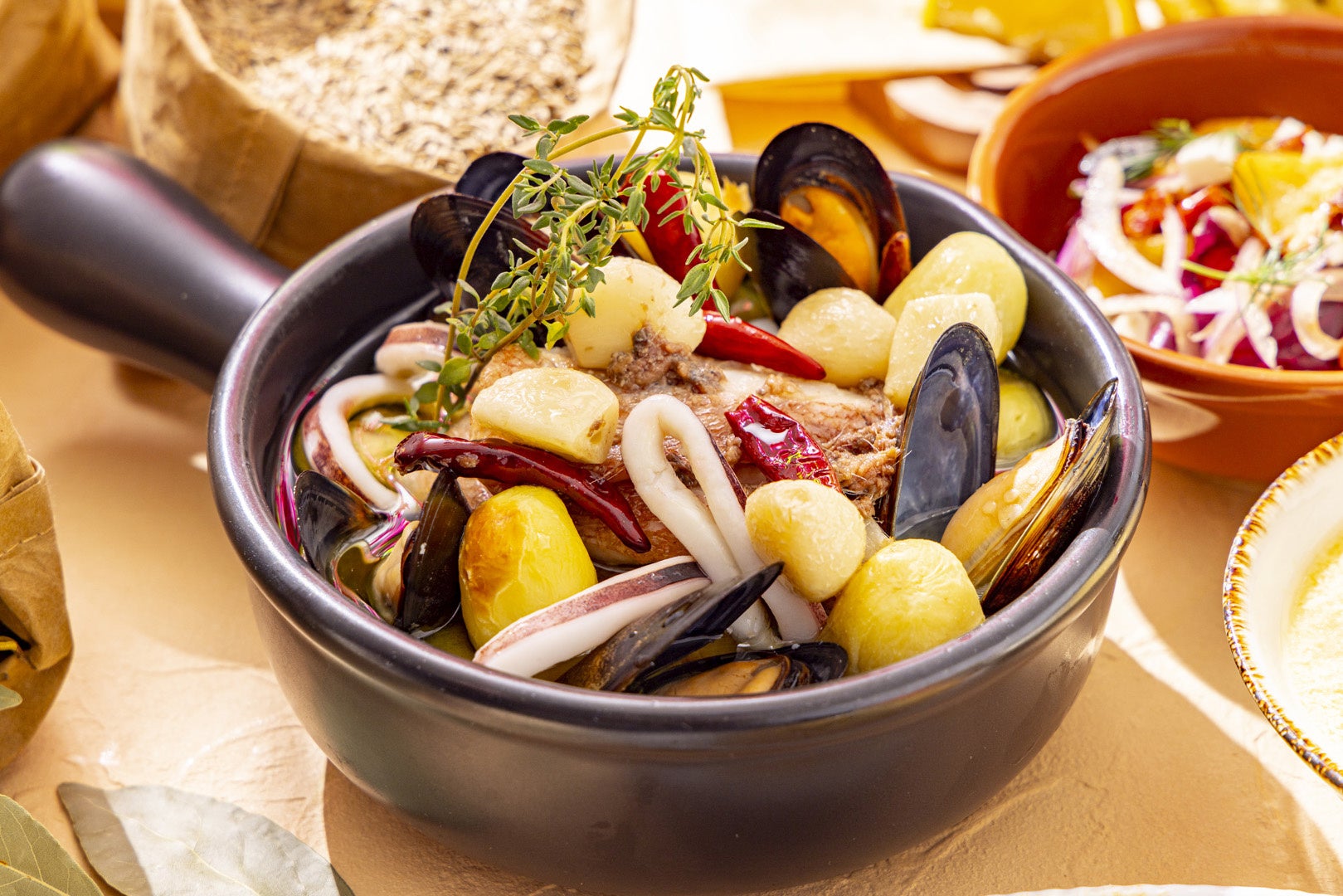 ムール貝、赤魚、イカなどの魚介やジャガイモをオリーブオイルとニンニクで煮込みコク深い味わいに。バゲットを浸してお楽しみいただけます。