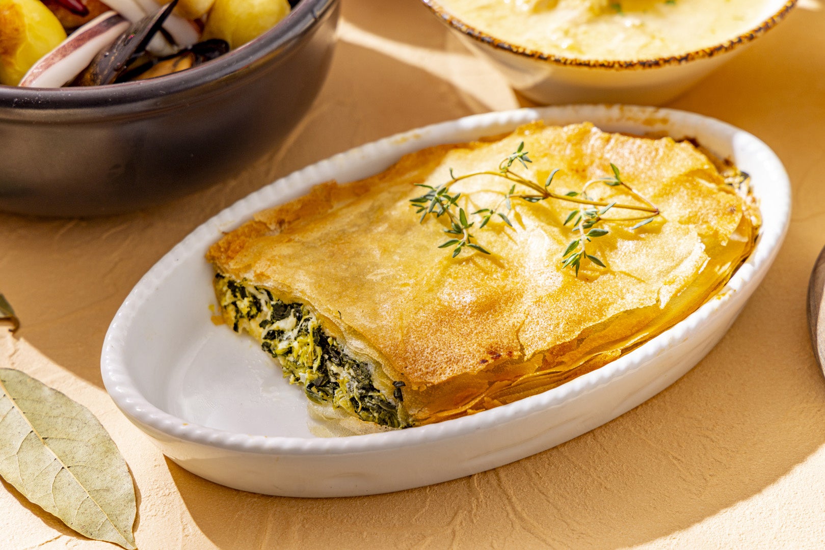 ほうれん草、玉ねぎ、チーズ、卵、ハーブをヘルシーに焼き上げたギリシャの塩味のパイ料理。