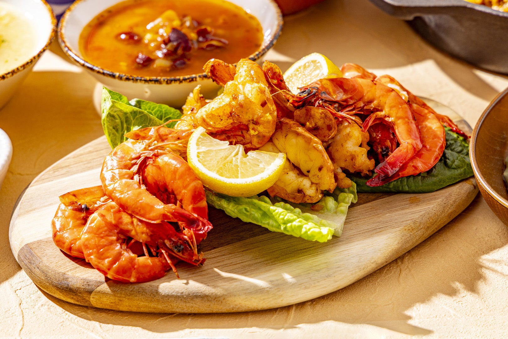 殻ごと食べられるソフトシェルシュリンプとぷりぷりのオニテナガエビをニンニクと塩、オリーブオイルで香ばしくシンプルに焼き上げました。