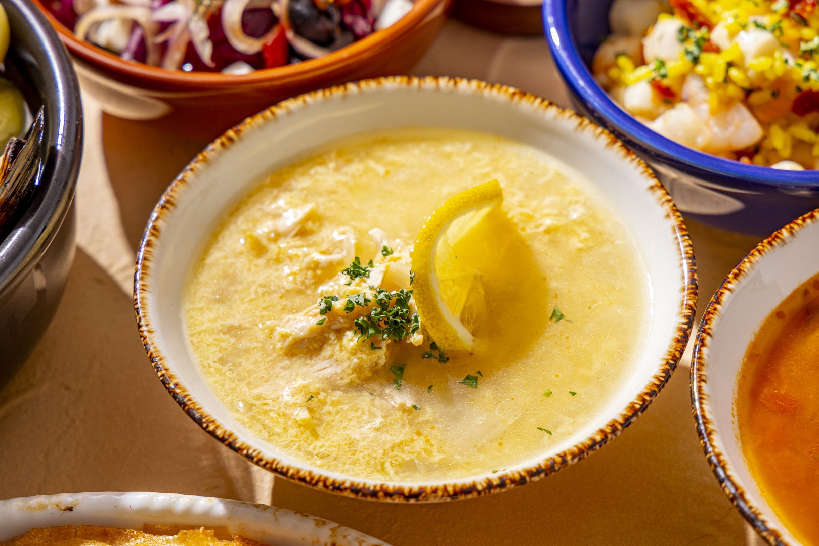 レモンの酸味が効いた「チキン&レモンスープ」や、オレガノとサフランの香りが食欲をそそる「地中海ビーンズスープ」を日替わりでご提供。