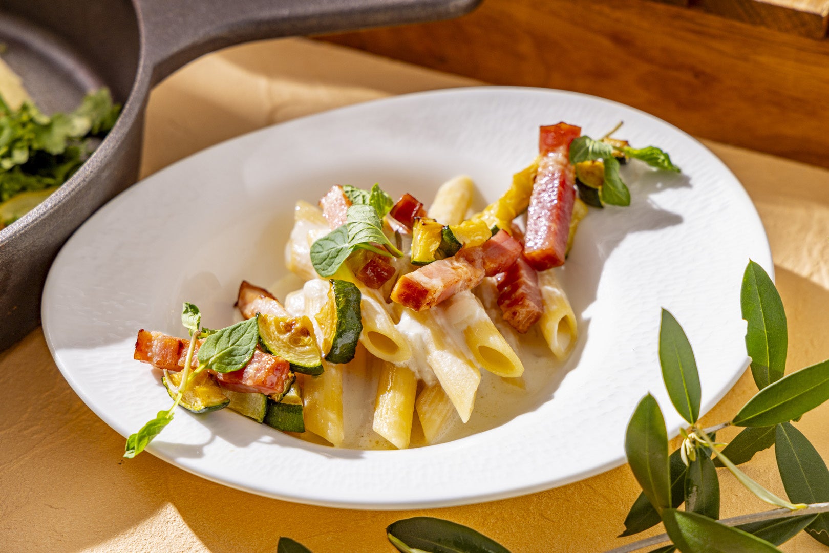 夏野菜のズッキーニとベーコンのクリームパスタにミントの清涼感を添えて。チーズホイールでパスタの濃厚さをお好みに調整いただけます。