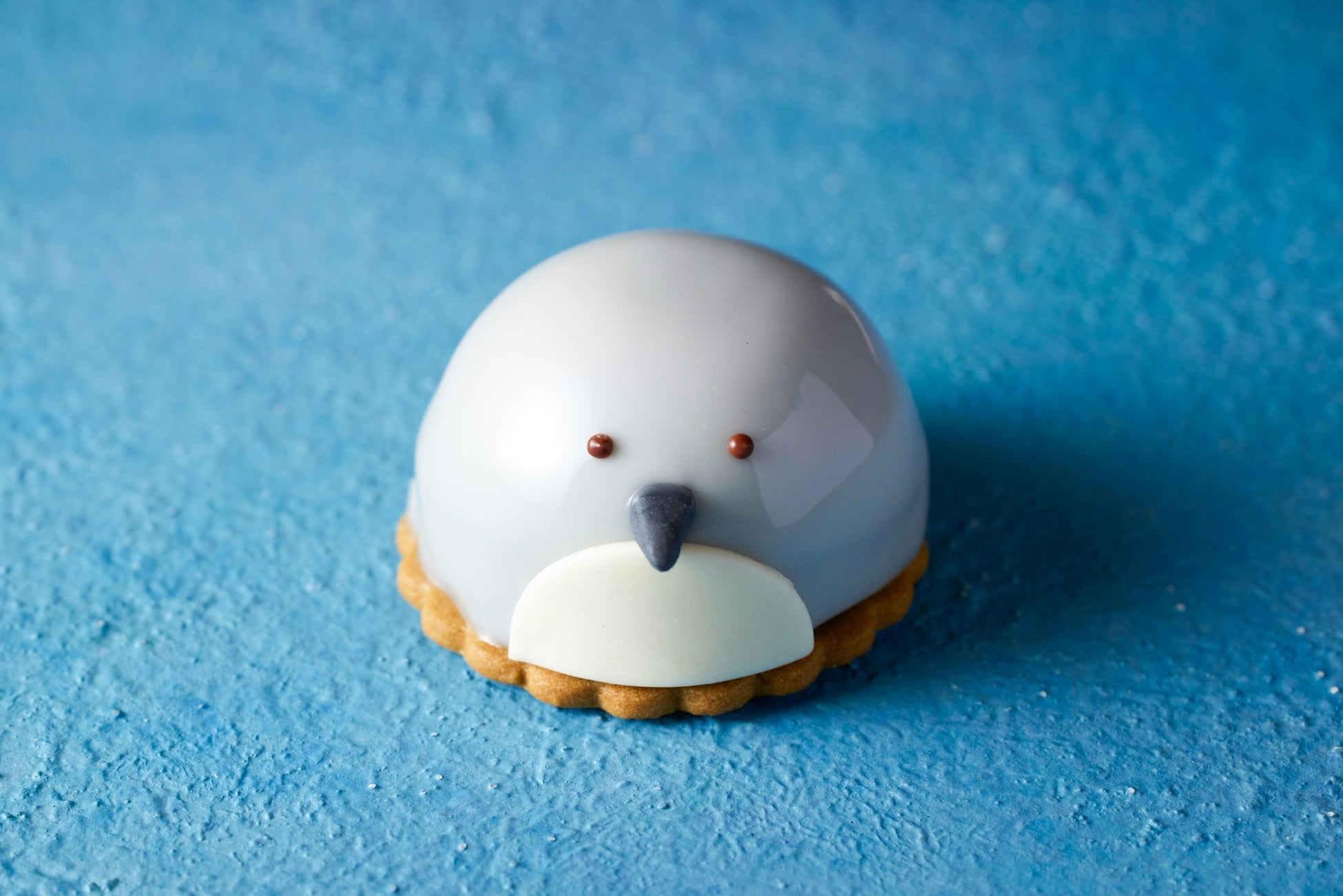 オーガニックチョコレートのムースの中にオレンジのコンフィチュールを入れた、甘味と酸味、苦みの爽やかな味わいがお楽しみいただけるチョコレートムースです。竹炭を混ぜて薄いグレーにしたホワイトチョコをコーティングし、可愛らしい赤ちゃんペンギンを再現しました。