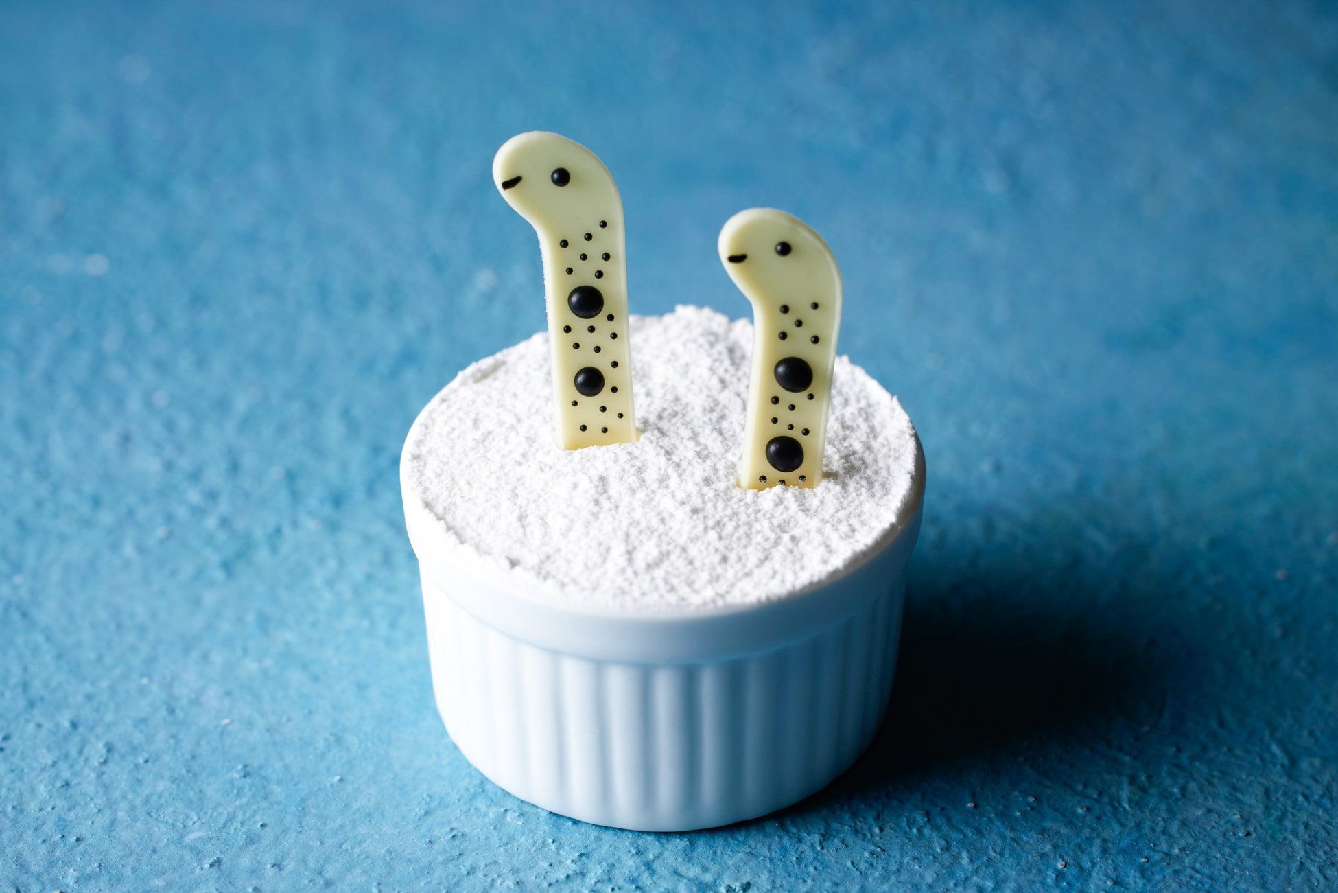 砂から体を伸ばして、ゆらゆらと揺れるチンアナゴの姿をモチーフにしたショートケーキです。ココットの中にスポンジ生地と北海道産の生クリーム、苺を入れ、ココナッツパウダーで蓋をし、巣穴を表現しました。ホワイトチョコレートで作った愛くるしい表情のチンアナゴに癒やされてください。