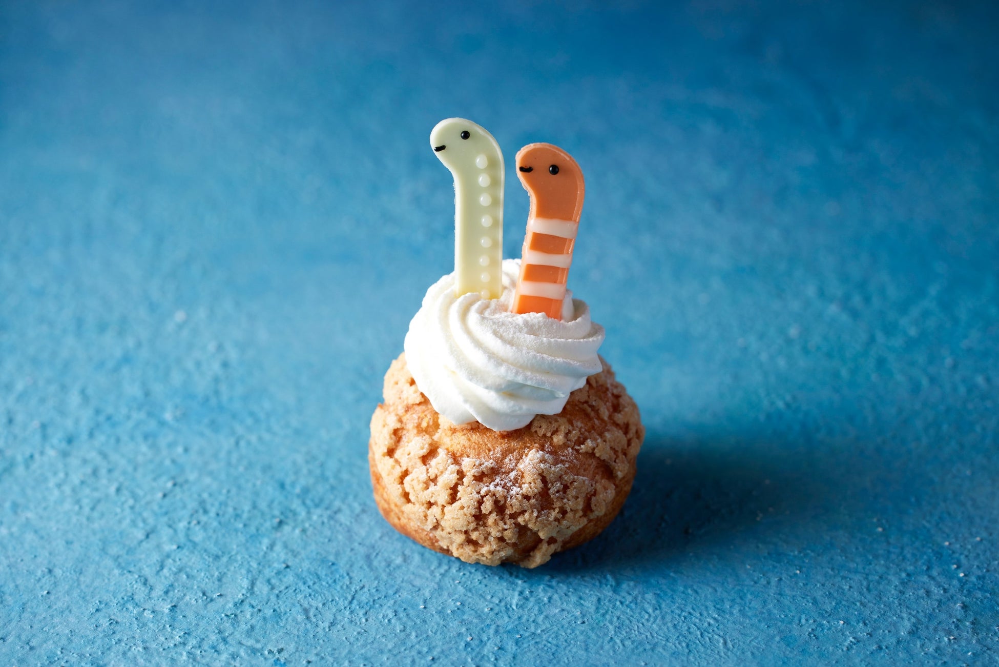 サクサクのクッキーシューの中にパイナップルのジャムとカスタードクリームをたっぷり詰めたミニシューで、フレッシュな甘さと濃厚なクリームの絶妙なコンビネーションをお楽しみいただけます。ホイップクリームから顔を出すニシキアナゴとホワイトスポッテッドガーデンイールが見た目にも可愛らしい一品です。