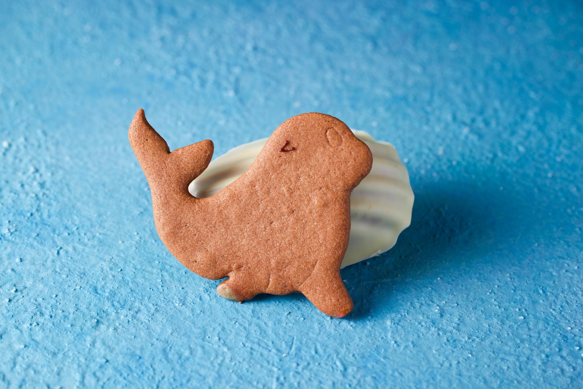 オットセイの形を模したチョコレートクッキーと、ホワイトチョコレートでコーティングし海辺に転がる可愛らしい貝に見立てたマドレーヌです。オーガニックシュガーを使用したマドレーヌの中にマジパンを入れ、しっとりとリッチに仕上げました。レモン風味で爽やかな味わいをご堪能ください。