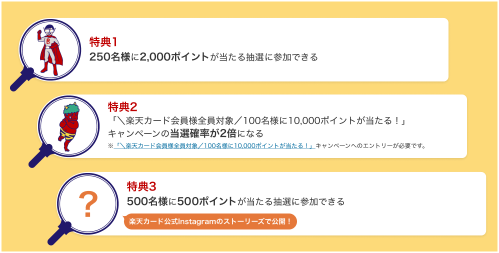 また、他の指定のイラストを見つけると同時期に開催中の「\楽天カード会員様全員対象/100名様に10,000ポイントが当たる!」キャンペーンの当選確率が2倍になる特典や、楽天カード公式Instagramのストーリーズで公開されるイラストを見つけると500名様に500ポイントが当たる抽選に参加する特典が得られます。