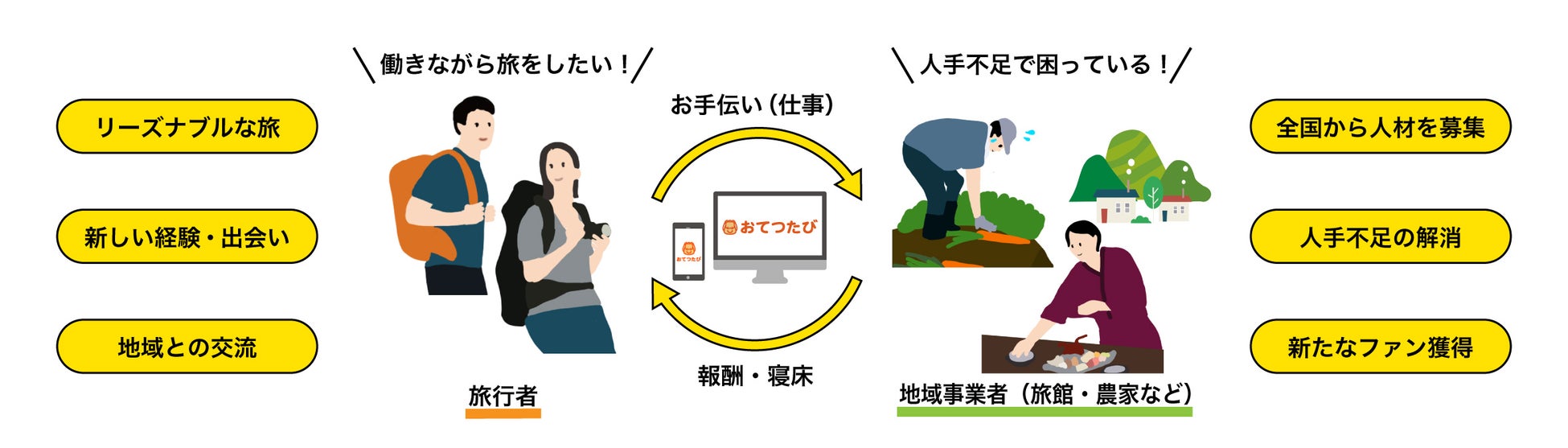 おてつたびは、「お手伝い」と「旅」を掛け合わせた造語で、短期的・季節的な人手不足で困っている地域の方々(農家や旅館など)と、地域に興味がある方が出会えるマッチングプラットフォームです。人手不足を人と人との出会いのチャンスに変え、誰もが気軽に“知らなかった地域”を訪れることで、地域や事業者のファンになって欲しい!そんな想いから生まれたサービスです。お手伝いを通じて、現地の人と時間を共有し、共に汗を流すことで地域のファンになり、日本各地に人と想いとお金が巡る世界を目指しています。