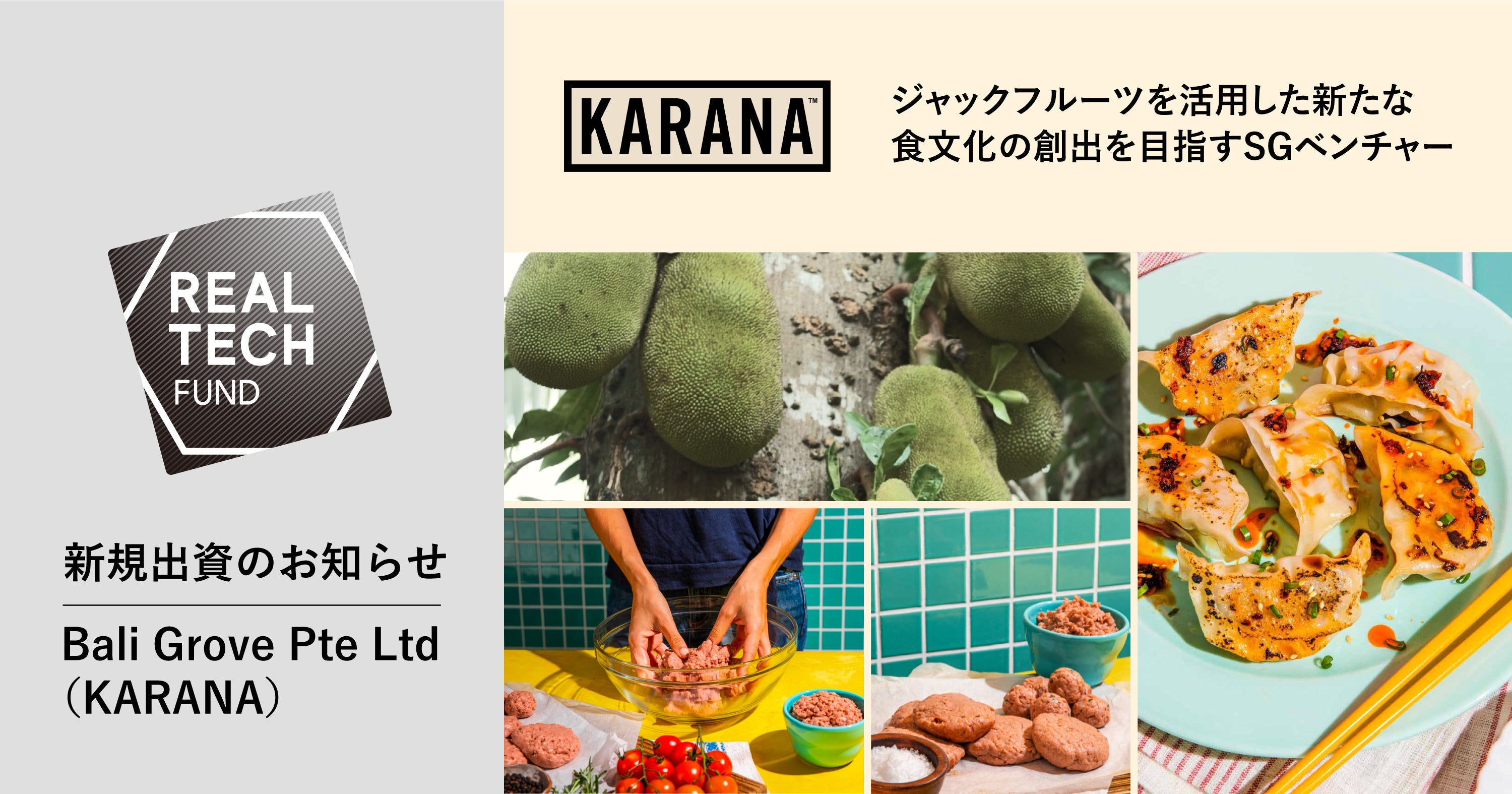 リアルテックホールディングス株式会社(所在地:東京都墨田区、代表:丸幸弘、永田暁彦、以下:「当社」)が運営するリアルテックグローバルファンド※は、Bali Grove Pte Ltd(以下「KARANA」(商標名)」への出資を実施したことをお知らせします。KARANAは、ジャックフルーツを活用した植物性代替肉の開発を通して、サステナブルで健康的な料理の提供を目指すフードテックベンチャーです。独自の加工技術を用いて、顧客の求める味・テクスチャー・栄養価・コスト・サステナビリティを実現する商品を開発しており、既にアメリカやシンガポールで販売を開始しております。当社は、日本の事業会社や研究機関との連携を促進し、新しい食文化の創出を支援してまいります。