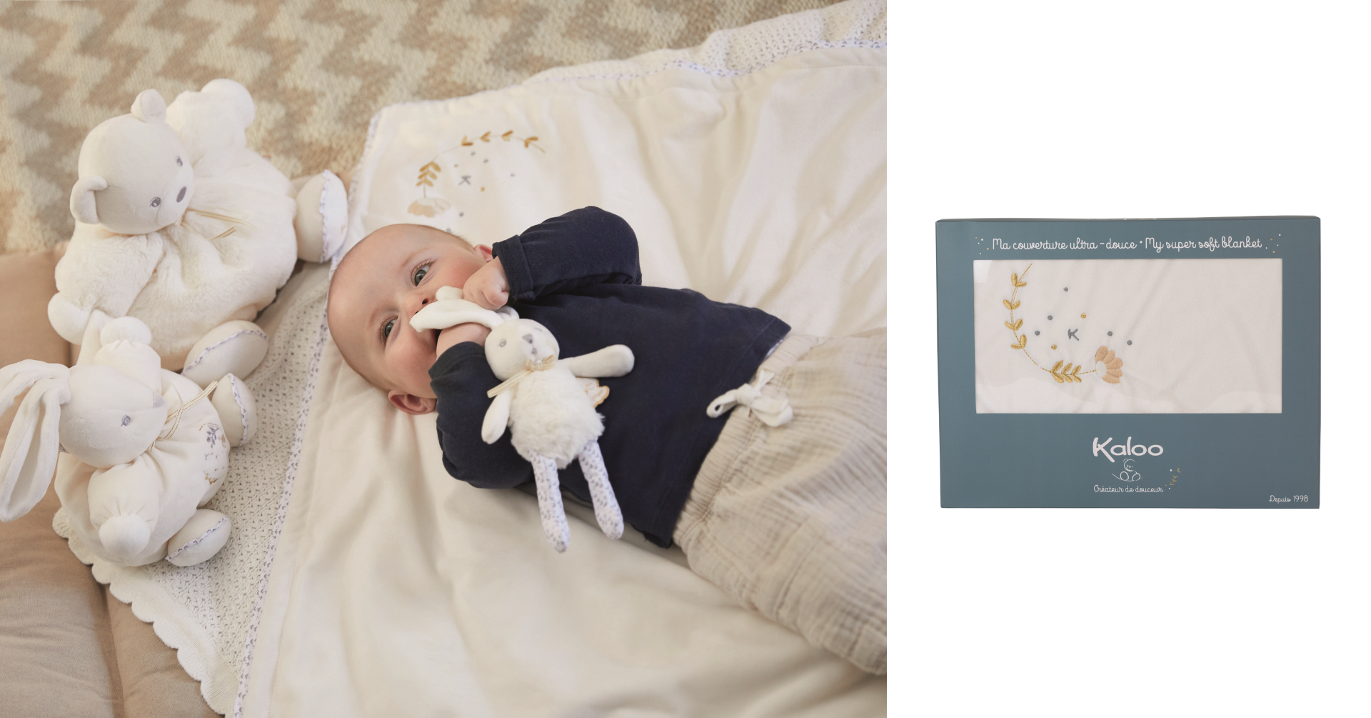 1998年にフランスで誕生したKalooは、ベビーギフトとして世界中で長く愛されています。手にすると実感できるやわらかさと、愛くるしさが魅力。全ての商品に高品質な素材を使用しているため、新生児期のベビーにも安心して使っていただけます。それぞれのBOXも、創立当初から変わらずコレクションごとにデザインされています。