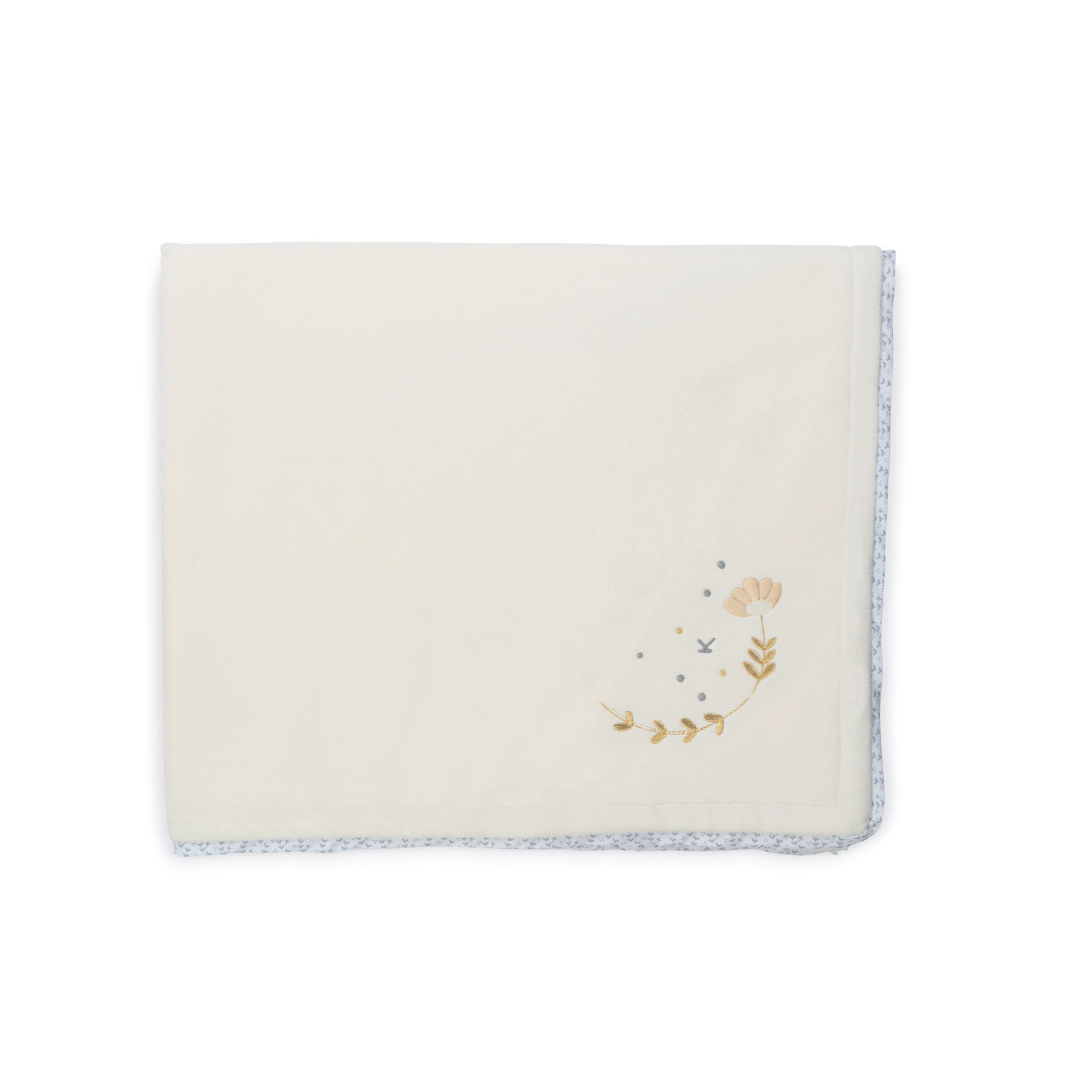 マイクロベロアを使用した、二枚合わせのブランケット。リーフモチーフのゴールドとシルバーの刺繍、パイピングがポイント。お出かけ先でも使いやすいサイズ感です。