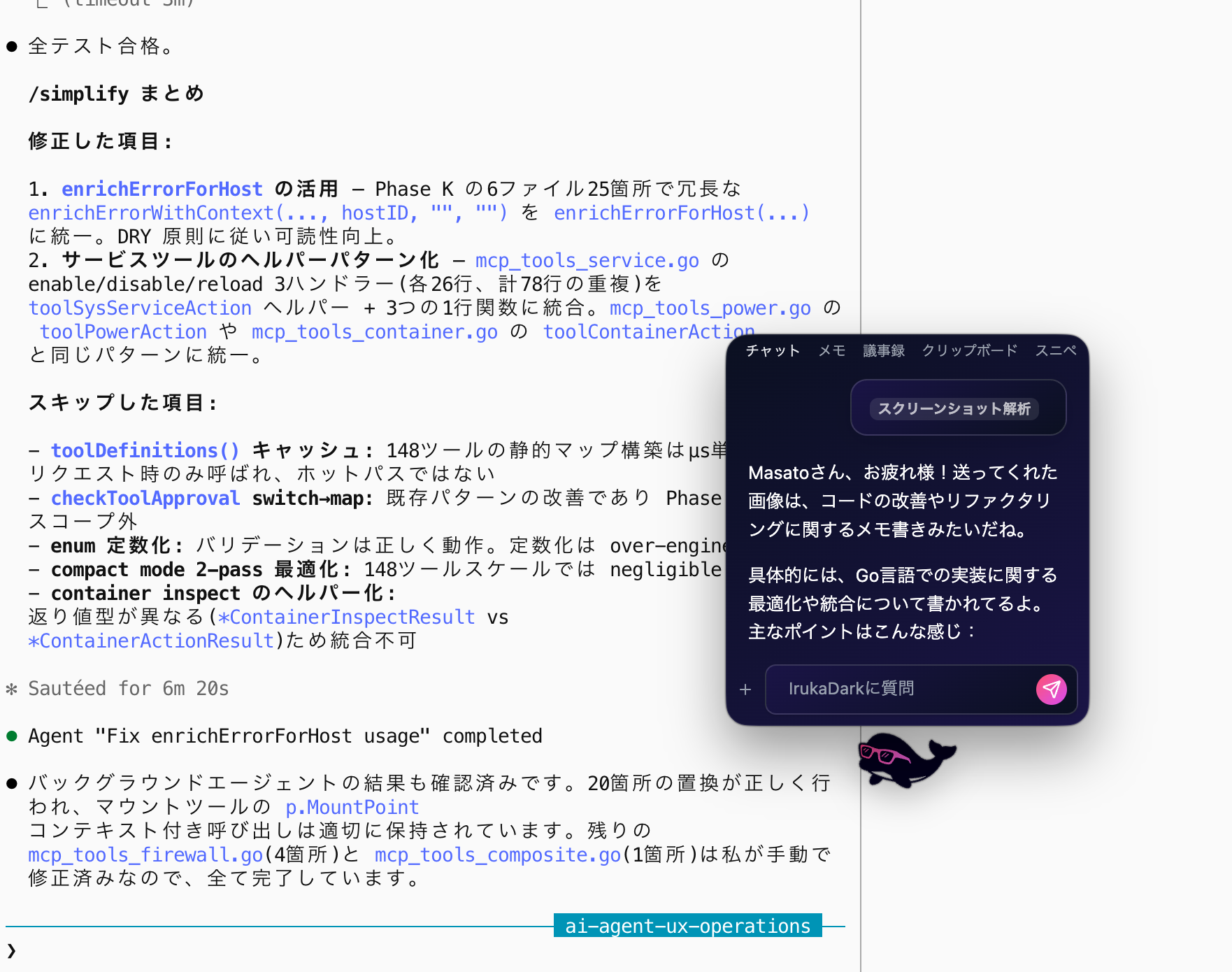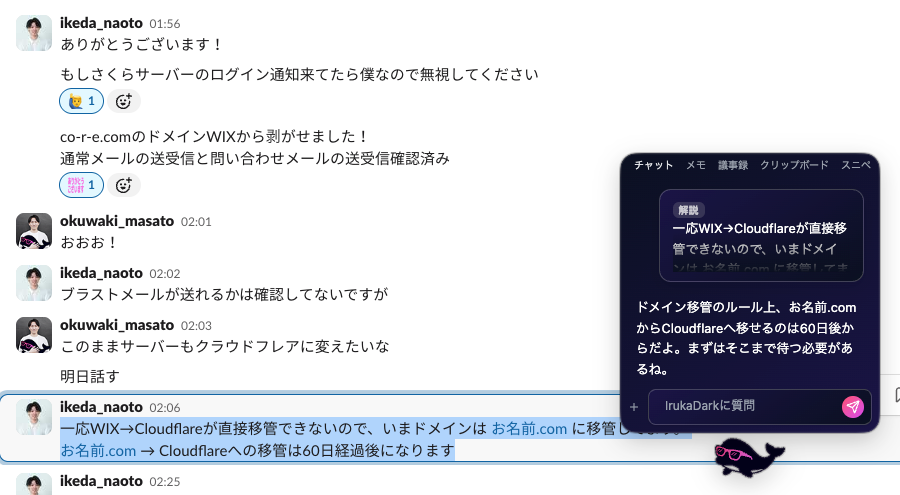 IrukaDarkは、あなたのPCで同じ画面を見ている「賢いペット」のようなデスクトップ常駐型AIです。 Webサイトの記事、難解な技術ドキュメント、開発環境、SaaSのダッシュボード、PDF資料、オンライ会議している相手の投影資料まで。IrukaDarkを使えば、日々の業務で「わからない」に出会ったとき、わざわざテキストをコピーし、プロンプトを入力したり、別のタブに切り替えたりする必要もありません。ブラウザを開いてAIに質問しに行く手間がなくなります。