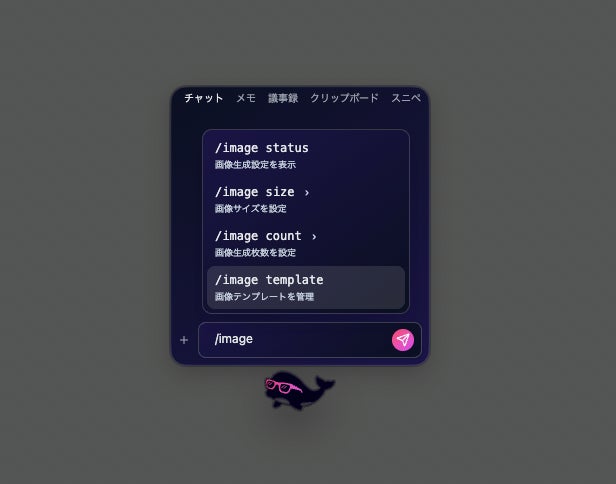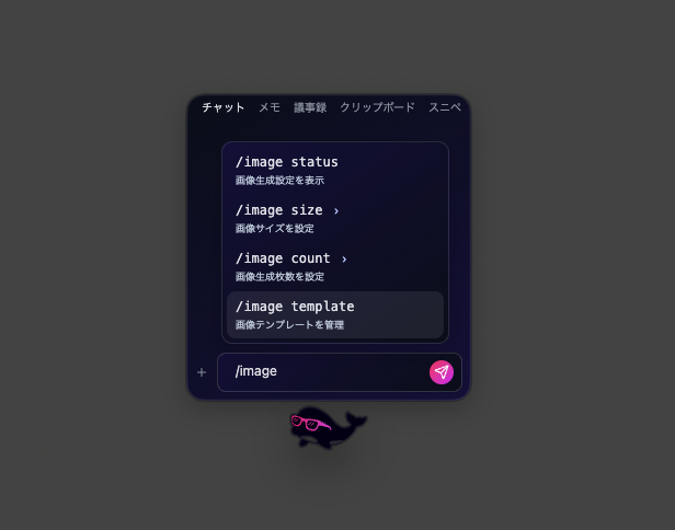 チャット上で@image、@video、@slideコマンドを入力するだけで各種クリエイティブを直接生成。テンプレート機能により、参照画像を毎回添付する手間も不要です。 |