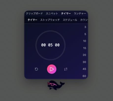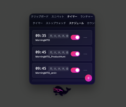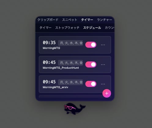 タイマー、ストップウォッチに加え、指定時刻にアプリやWebサイトを自動で開くスケジュール機能を搭載。会議URLをセットすれば、時間になると自動でアクセスします。 |