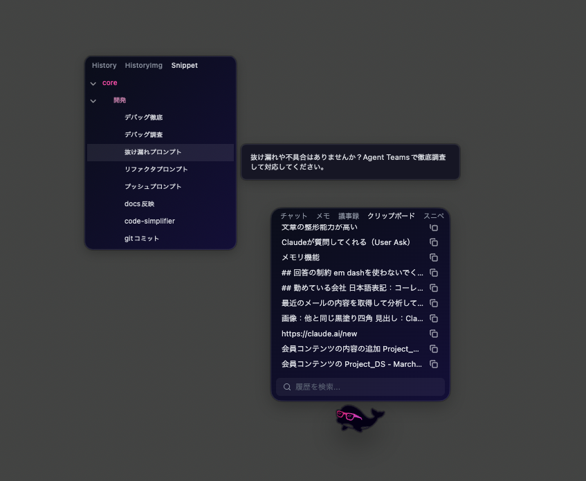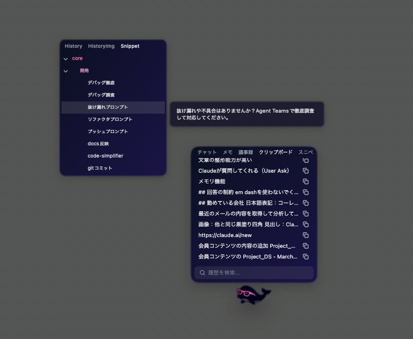 クリップボードの履歴を1000件以上も永続的に自動保存(テキスト最大1000件、画像最大30枚)。複数のコピーを連続で積み上げて順番にペーストできるため、繰り返しのコピペ作業が一気に高速化します。よく使うフレーズのスニペット登録に対応。複数のコピーを連続で積み上げてから順番にペーストする「スタックペースト」も可能です。よく使うプロンプトなどをセットしておくと、とても便利です。