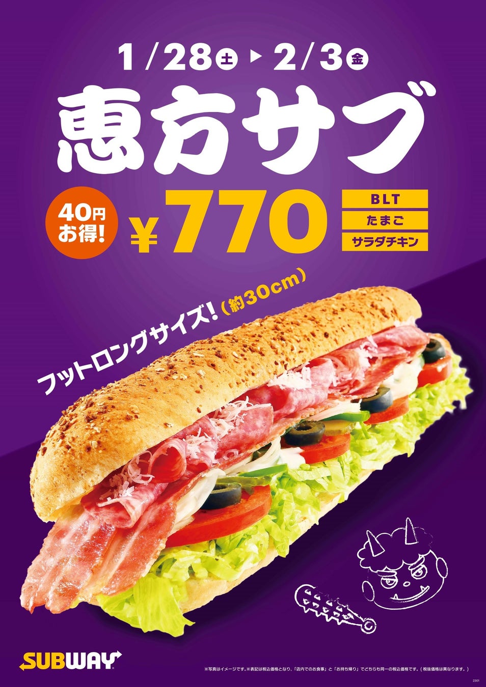 そして今年も、1月28日(土)~2月3日(金)の節分の時期限定で、好評の『恵方サブ』の発売が決定しました。お待ちかね、BLT、サラダチキン、たまごの3種のフットロングサイズがこの時期限定でおトクに楽しめるチャンスです。長さ約30センチ、食べ応え充分の長~いサンドで、今年一年も縁起よく過ごしましょう。