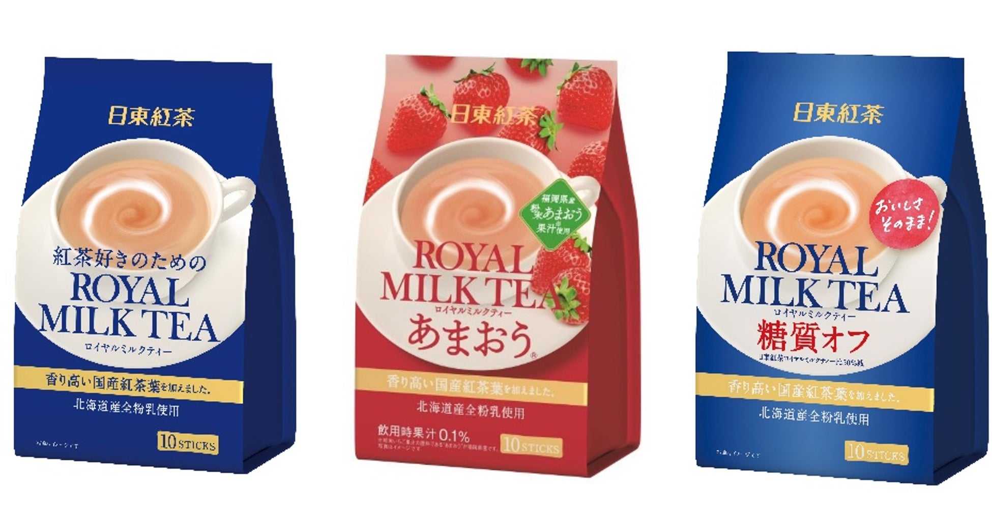 日東紅茶のロングセラー商品「日東紅茶 ロイヤルミルクティー」。ミルクティーの美味しさを広げるフレーバータイプの「ロイヤルミルクティーあまおう」や健康志向を反映した「ロイヤルミルクティー糖質オフ」をシリーズとして発売し、お湯を注ぐだけで楽しめるインスタントティーとしてご好評をいただいています。