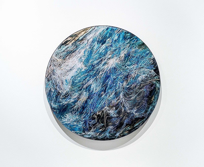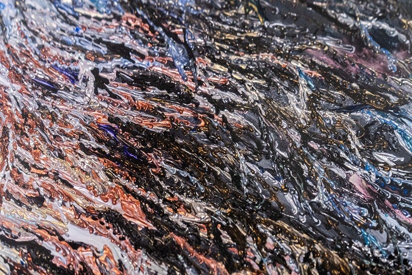 一方、高山は1990年山口県出身。2016年に東京造形大学大学院 造形研究科美術専攻領域を修了。アクリル絵の具を流れる粒子のように物質的な状態として扱い、積層して彫刻刀やカッターの刃などを⽤いて 削り出すなど、 平面を主な媒体としながら、触覚的あるいは彫刻的ともいえる⼿法を用いて制作をしています。