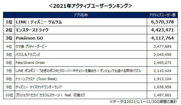 2021年ゲームアクティブユーザ数ランキング_総合1位は『LINE:ディズニーツムツム』