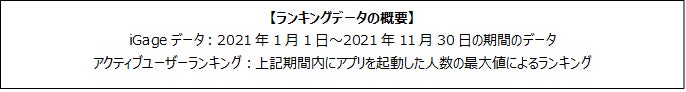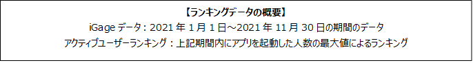 2021年も残りわずかとなりました。今年も多くのゲームアプリが配信されてきました。そこで弊社が提供するマーケティングデータベースiGageを使用し、2021年1月~11月にアクティブユーザー数が多かったタイトルをランキング形式で見ていきたいと思います。