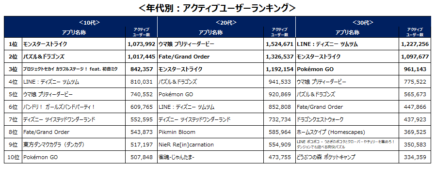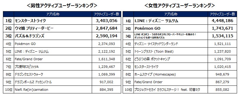 ■男性は『モンスターストライク』、『ウマ娘 プリティーダービー』、女性は『LINE:ディズニーツムツム』、『Pokémon GO』