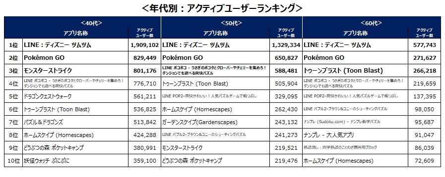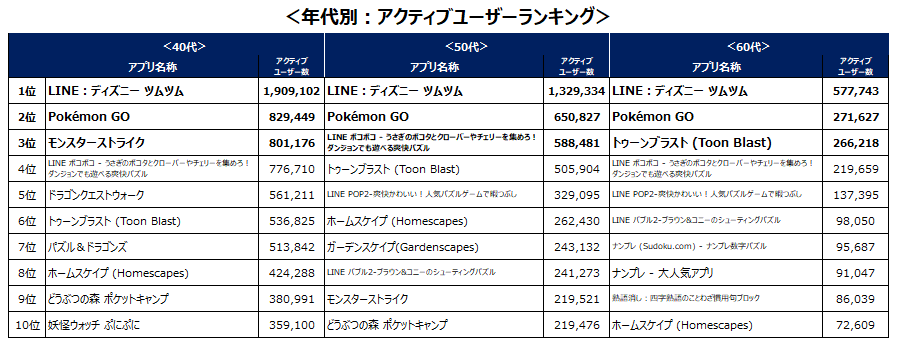 40代は、30代と同じくTOP10にパズルゲームや位置情報ゲームが多くランクインしています。特徴的なのは10位に『妖怪ウォッチ ぷにぷに』がランクインしており、親世代が自身のスマホで子供に遊ばせていることが推察されます。
