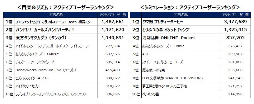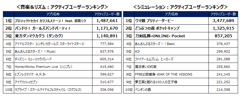 ■音楽&リズムは『プロジェクトセカイ カラフルステージ! feat. 初音ミク』、シミュレーションは『ウマ娘 プリティーダービー』が1位