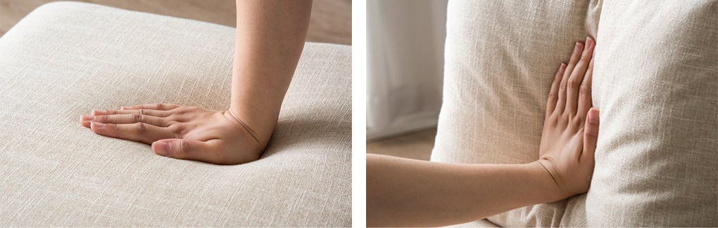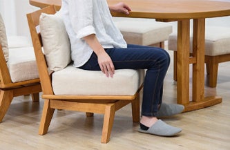 座面の座り心地はやや硬めにすることで、しっかりと体を支え、立ち座りがしやすくなっています。クッションは柔らかめで、寄りかかったとき包み込まれるような感覚でリラックスすることができます。