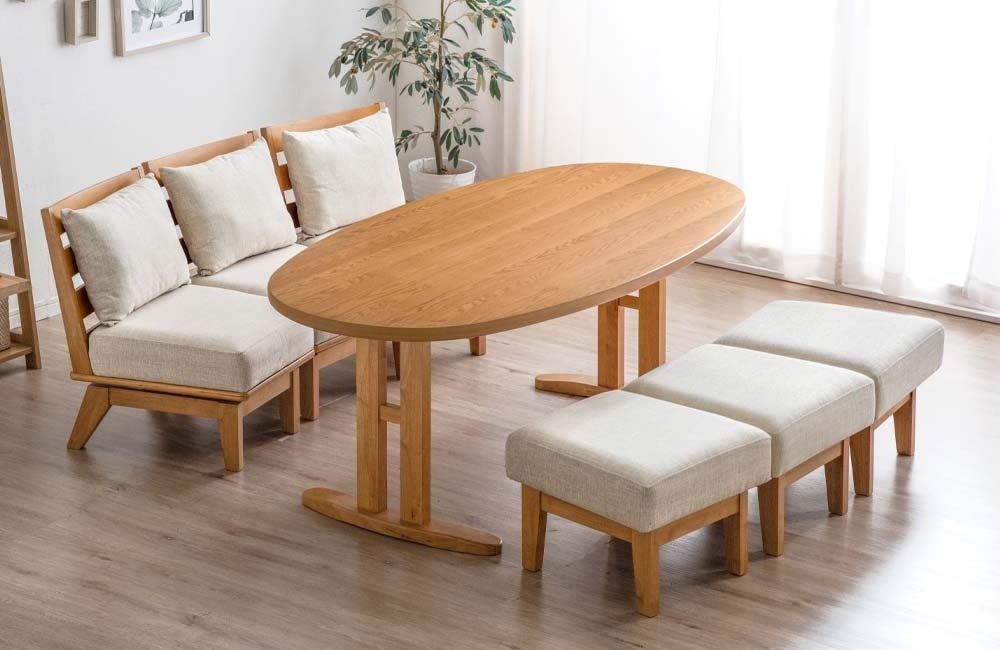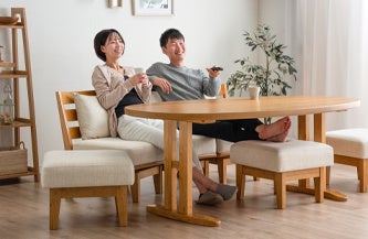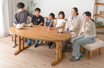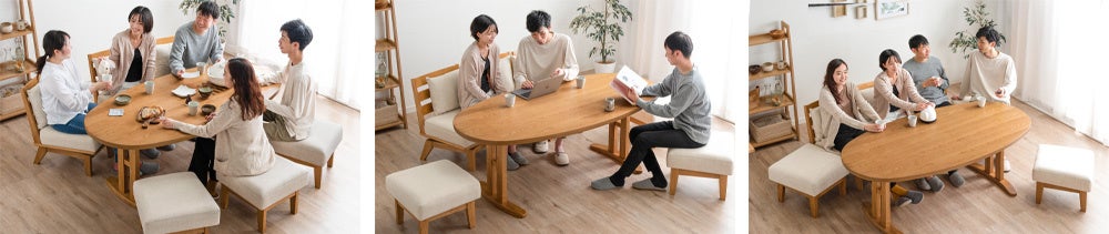 テーブルに合わせてチェアも楕円形(オーバル)に繋がる!タンスのゲンより、家族が輪になるダイニングテーブルセット発売