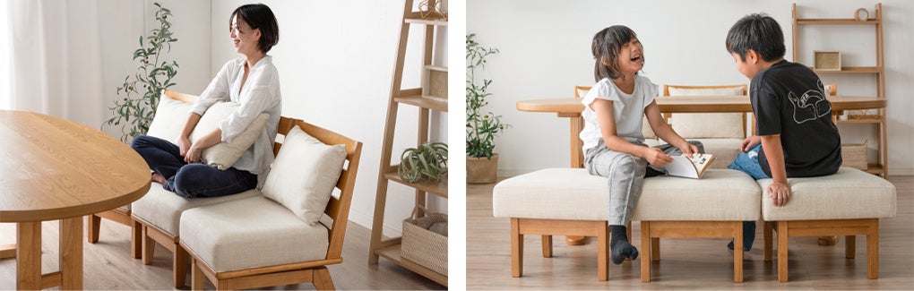 『Waninaru』に使用されているチェアは、隣り合わせで並べることでソファとして使用できます。もちろん、それぞれを単体のチェアとしても使えます。この機能により、ご家族で過ごす様々なシーン合わせて自由にレイアウトできる、新しいデザインとなりました。