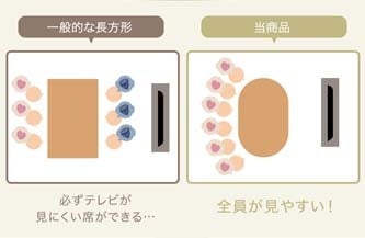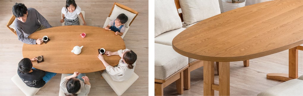 本製品は、どこの位置に座っても中心を向いてテーブルを囲むことができるよう、オーバル(楕円)型の天板を採用しました。無理に体の向きを変えることなく自然と互いの顔が見やすい形状になっています。
