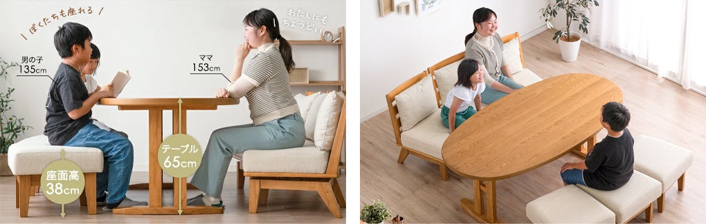 一般的にダイニングテーブルの高さは(天板まで)70~72cm、ダイニングチェアの高さは(座面まで)40~42cmの製品が多いですが、『Waninaru』はテーブルの高さ65cm、チェアの高さ38cmとなっており低めに設計されています。こうすることで、お子様が自力で座ることができ、足もつきやすい高さになりました。また、小柄な方やご年配のご家族も楽にご使用いただけます。