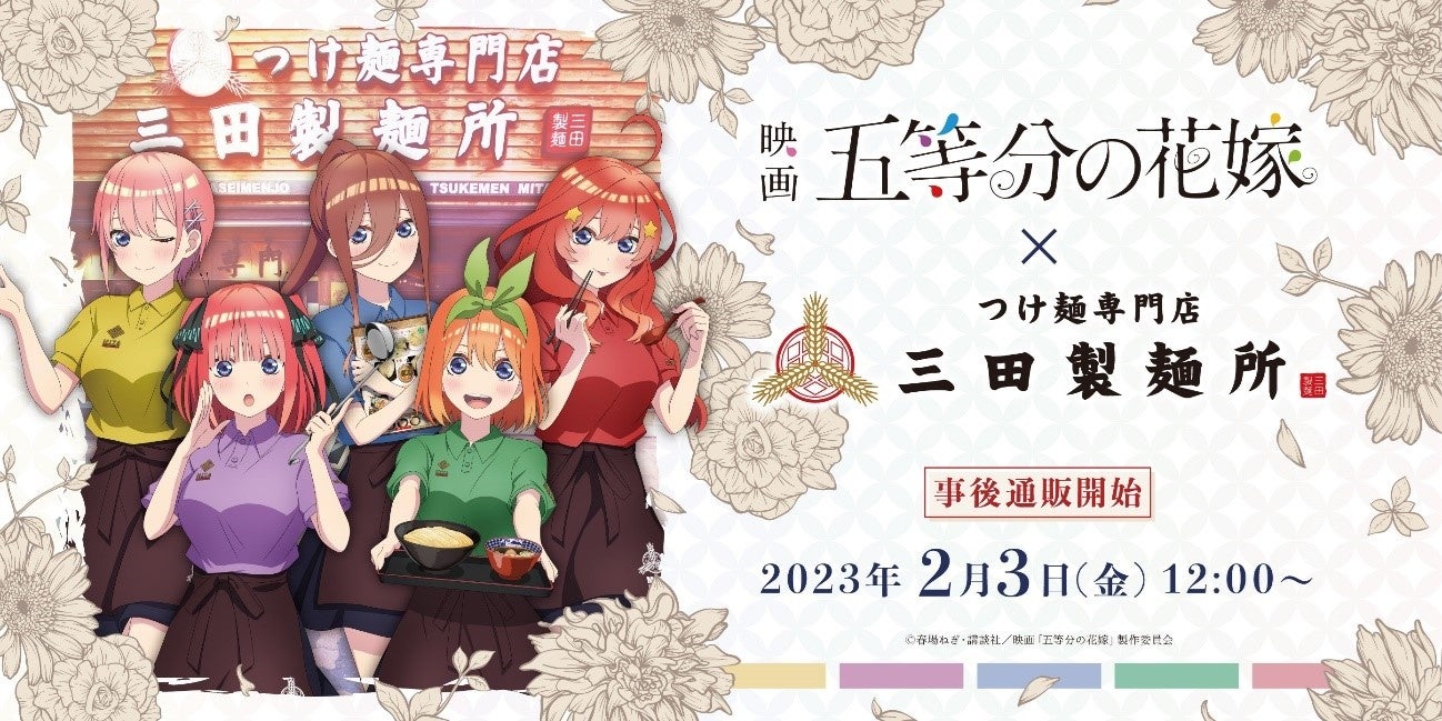 2023年2月3日(金)より、株式会社エムピーキッチン(本社:東京都渋谷区、代表取締役:村上竹彦)が運営する「つけ麺専門店 三田製麺所」は、映画「五等分の花嫁」とのコラボキャンペーンの事後通販を行っております。