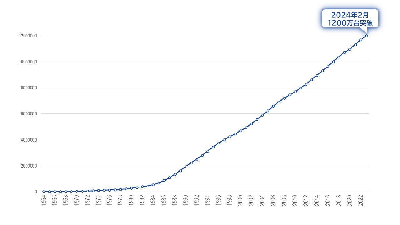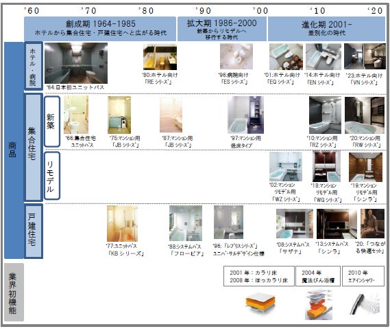 1966年には、マンションやアパートなどの集合住宅用ユニットバスルームを発売し、1977年には、戸建用のユニットバスルームを発売しました。その後、マンションの取換え需要を見据えたマンションリモデルバスルームを発売、業界初の「カラリ床※2」や「魔法びん浴槽※2」など、お客様の生活価値を向上させた商品を発売し続け、浴室の進化をけん引してきました。1964年9月の誕生以来、着実に販売台数を伸ばし、2024年2月に「ユニットバスルーム」の累計出荷台数が1200万台を突破しました。現在では日本におけるおよそ9割※3がユニットバスルーム工法によるもので、日本の浴室のスタンダードとなりました。