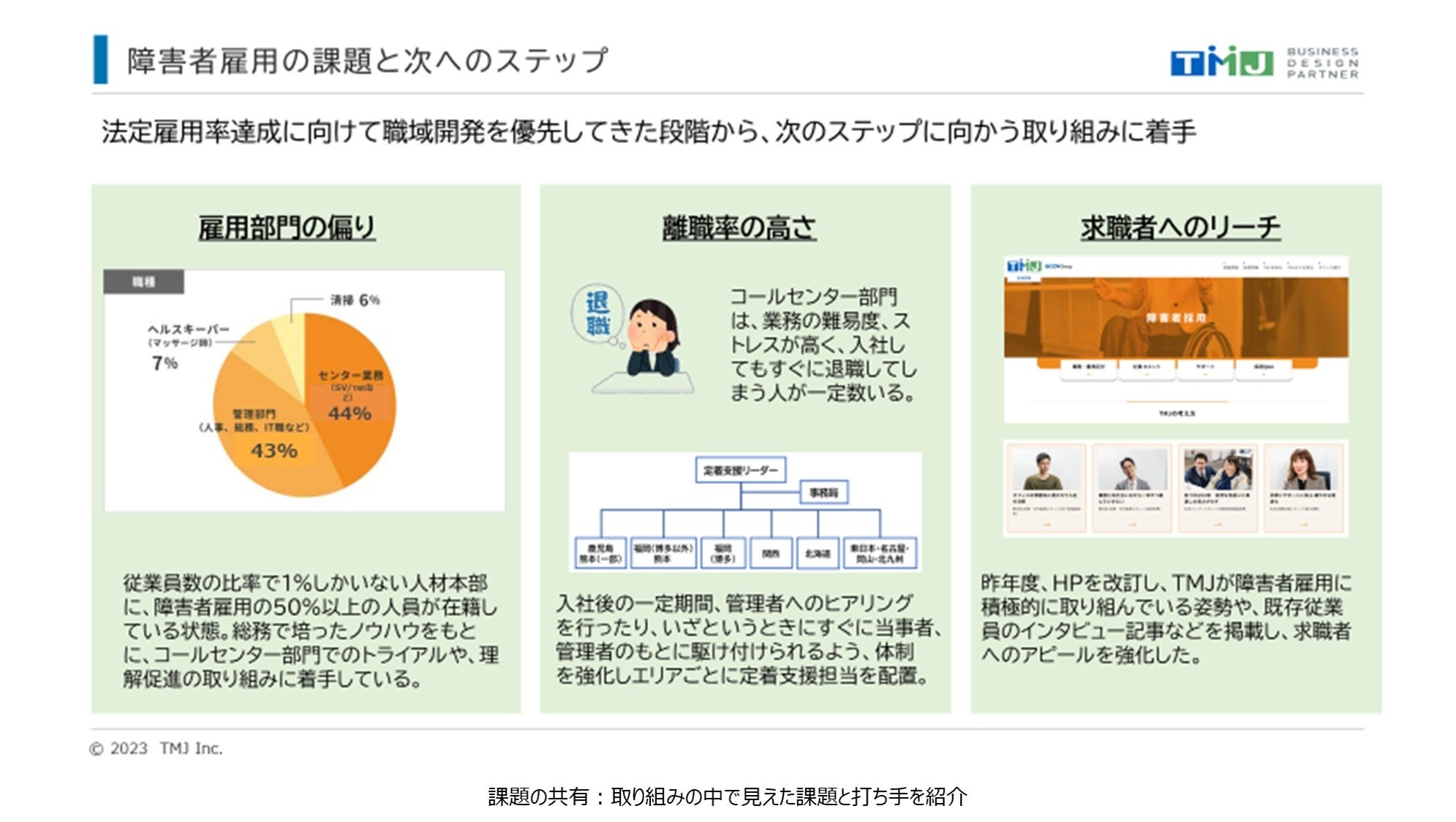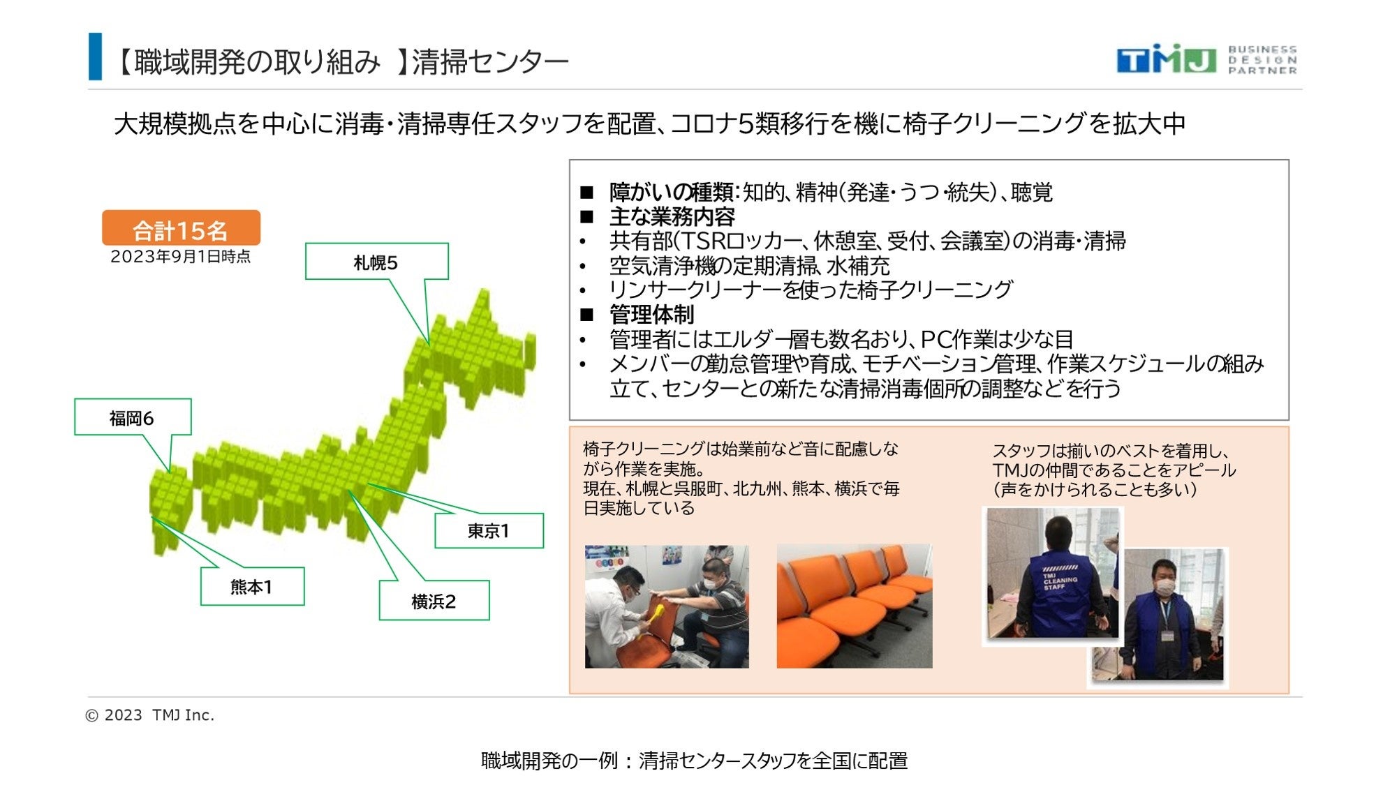TMJは法定雇用率の達成はもちろん、真のDEI実現に向けた職場環境を目指すと共に、働くことに障害をもつ方々が活躍できるよう、地域や各企業と連携した様々な取り組みを進めてまいります。