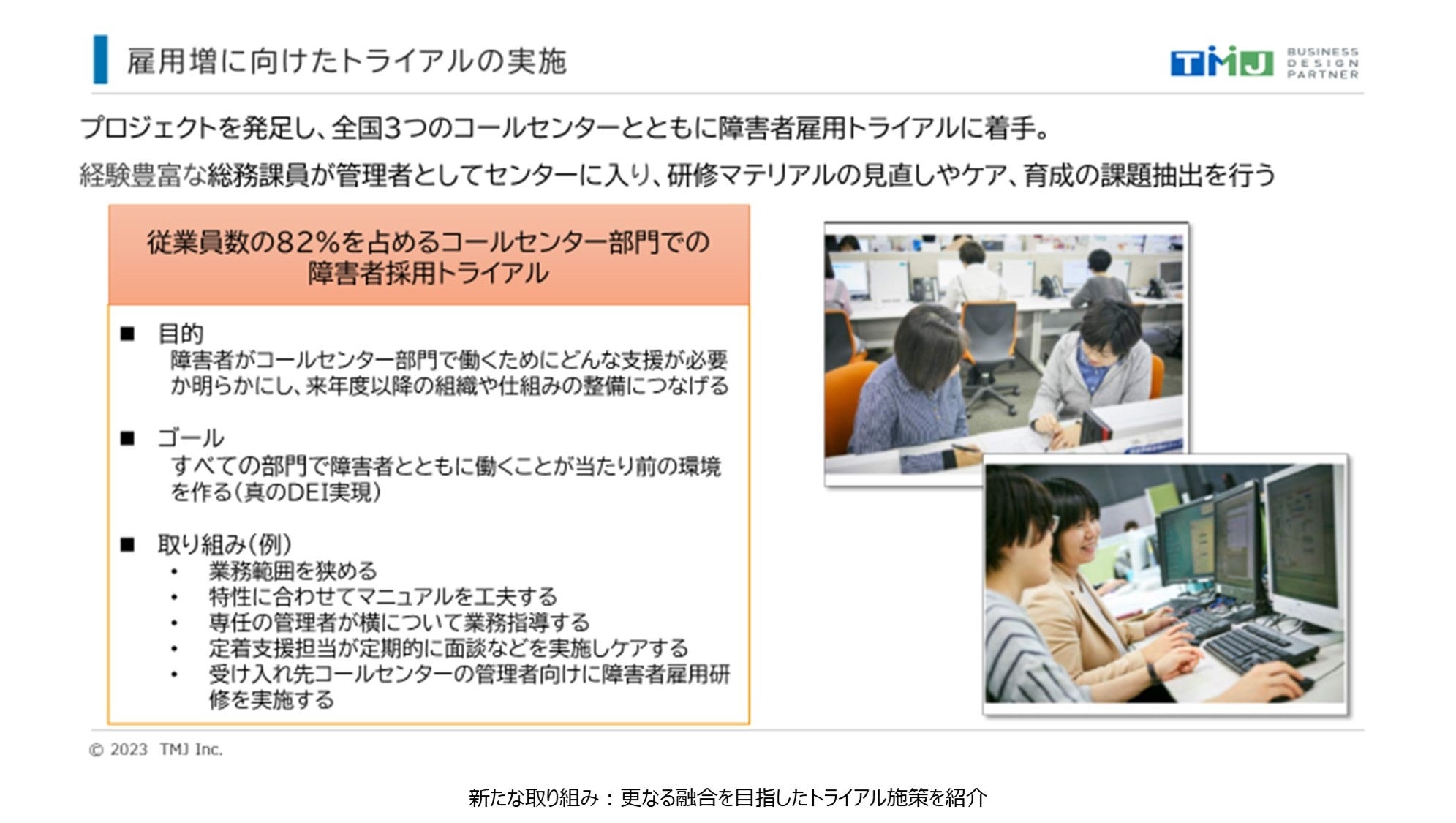 障害者雇用におけるTMJの考え方や、サポート体制、就業者の声などを紹介しています。