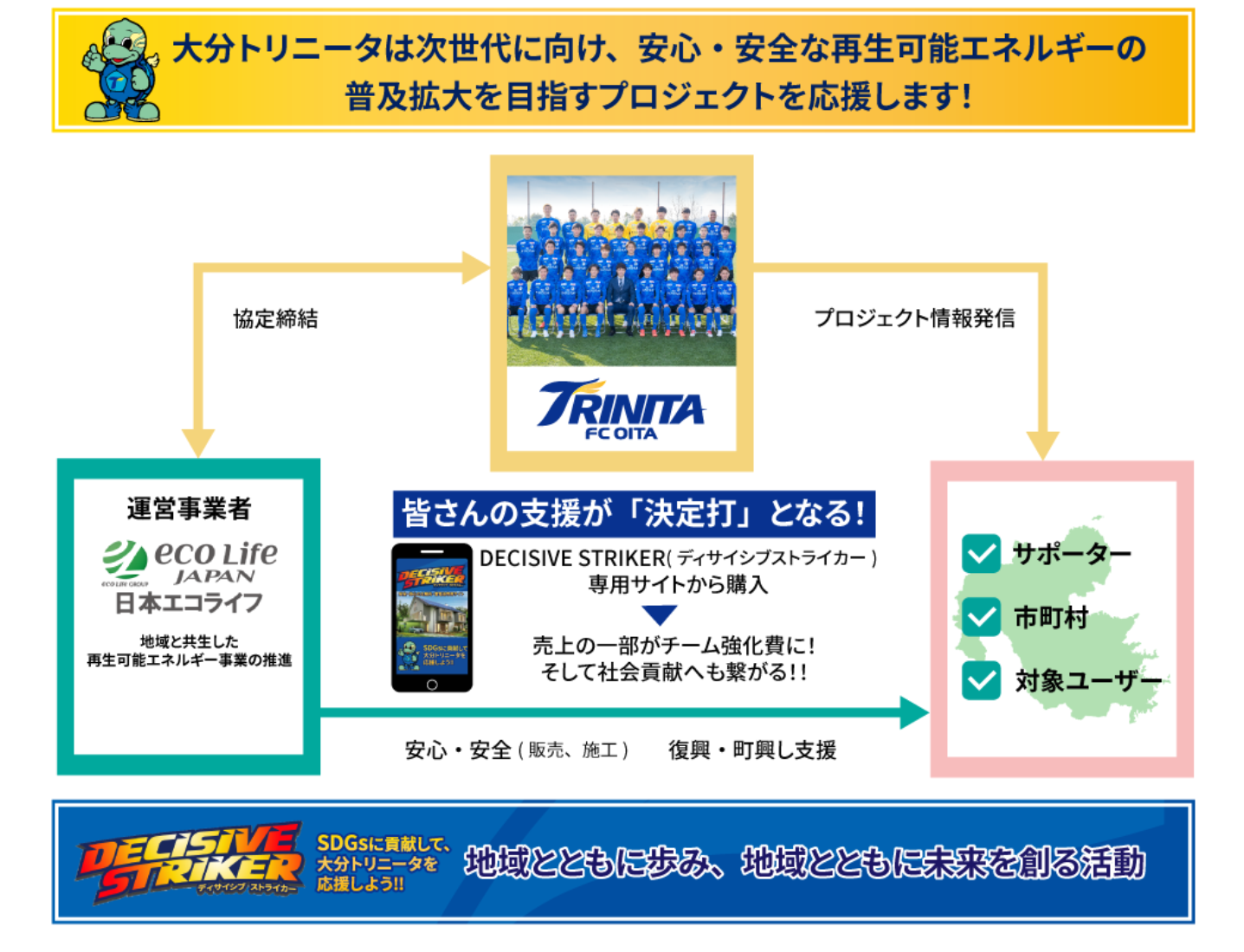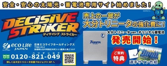 この度、大分トリニータ クラブスポンサーの株式会社日本エコライフ社にて、お得な価格で太陽光・蓄電池をお求め頂けるDecisive striker(ディサイシブ ストライカー/決定打)キャンペーンを実施いたしますので、以下の通りお知らせいたします。尚、大分トリニータ エリアライセンス制度をご活用頂く事により、売り上げの一部は大分トリニータの強化費としてご支援頂きます。