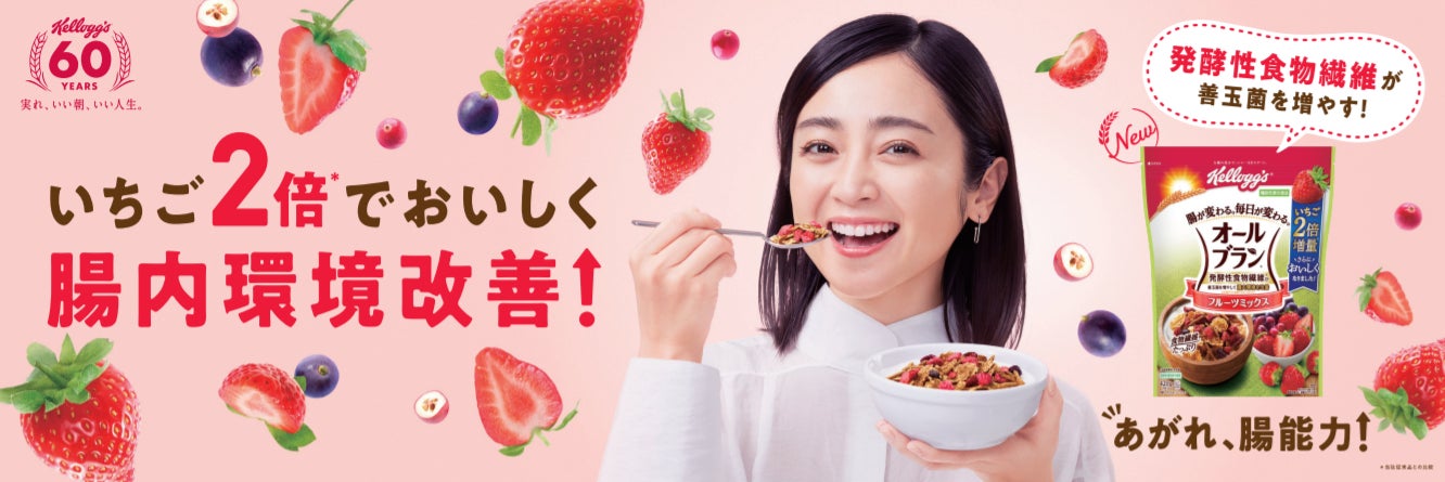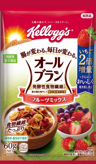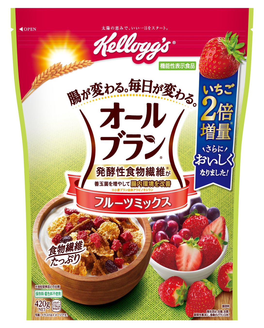 シリアル食品の世界シェアトップブランド「ケロッグ」を日本国内で展開する日本ケロッグ合同会社(本社:東京都千代田区、代表職務執行者社長:井上ゆかり)は、2022年2月下旬よりオールブランシリーズの中でも最も人気が高い「オールブラン フルーツミックス」 をリニューアルし、全国のスーパー、ドラッグストアなどにて販売いたします。(一部取り扱いのない店舗がございます。)「オールブラン」シリーズは、2020年4月に小麦ブラン由来の「発酵性食物繊維(アラビノキシラン)」により、善玉菌を増やして腸内環境を改善する機能性表示食品としてリニューアル。今回、製品に含まれる、いちごの量を2倍*に増量し、さらにおいしくなりました。