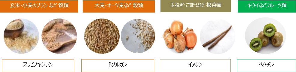 発酵性食物繊維とは、腸内細菌によって発酵されやすい食物繊維を指します。腸に棲む善玉菌のエサとなり腸内で発酵(分解)されることにより、腸内環境を整える短鎖脂肪酸を発生させます。発酵性食物繊維は、穀物や根菜などの食品に多く含まれます。小麦や玄米の「ぬか(ブラン)」部分に含まれる「アラビノキシラン」、大麦やオーツ麦に含まれる「βグルカン」、ごぼうや玉ねぎなどに含まれる「イヌリン」、フルーツ類に含まれる「ペクチン」などが代表的な発酵性食物繊維です。