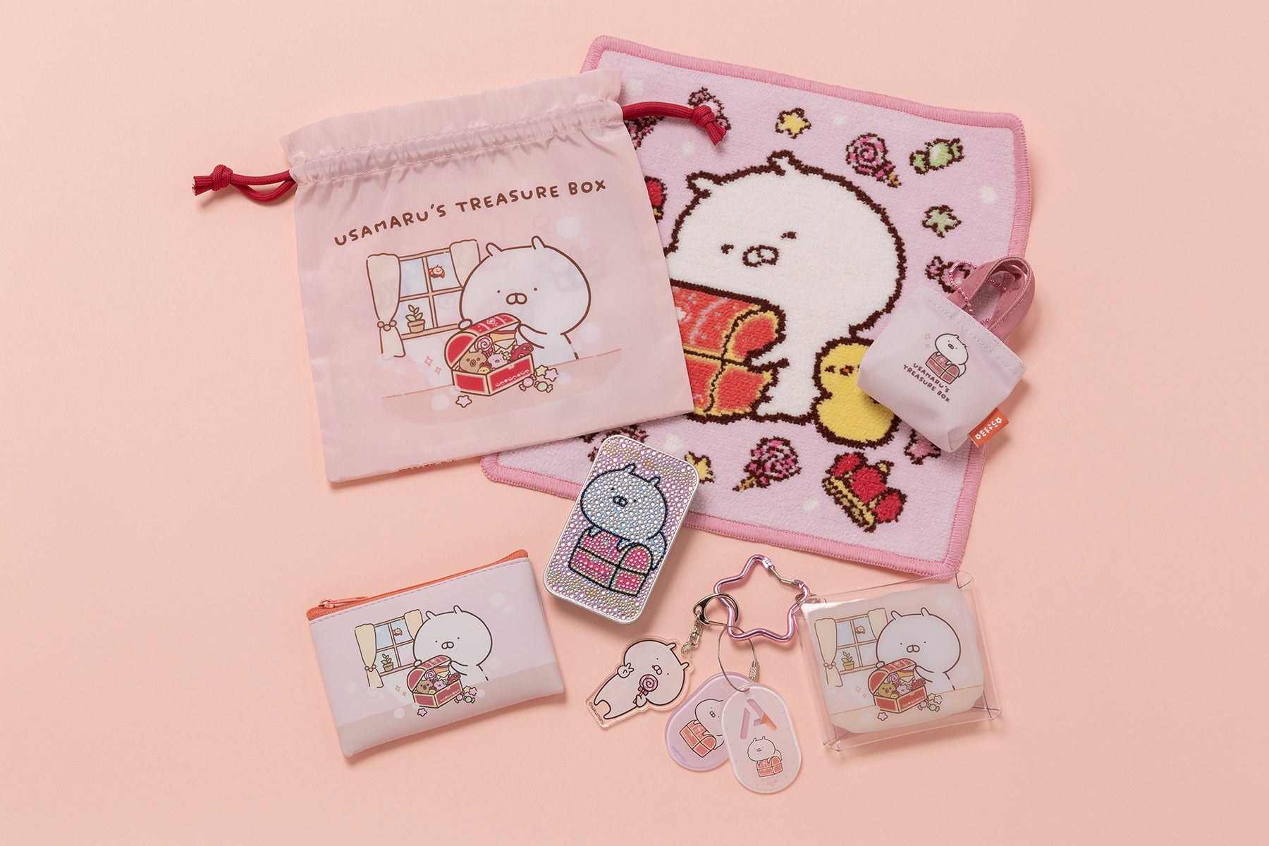 ドレスアップしたうさまるたちと、うさまるのたいせつなものが詰まった宝箱、2種類の描き下ろしアートが活かされた、特別感あふれるオリジナルグッズが揃っています。