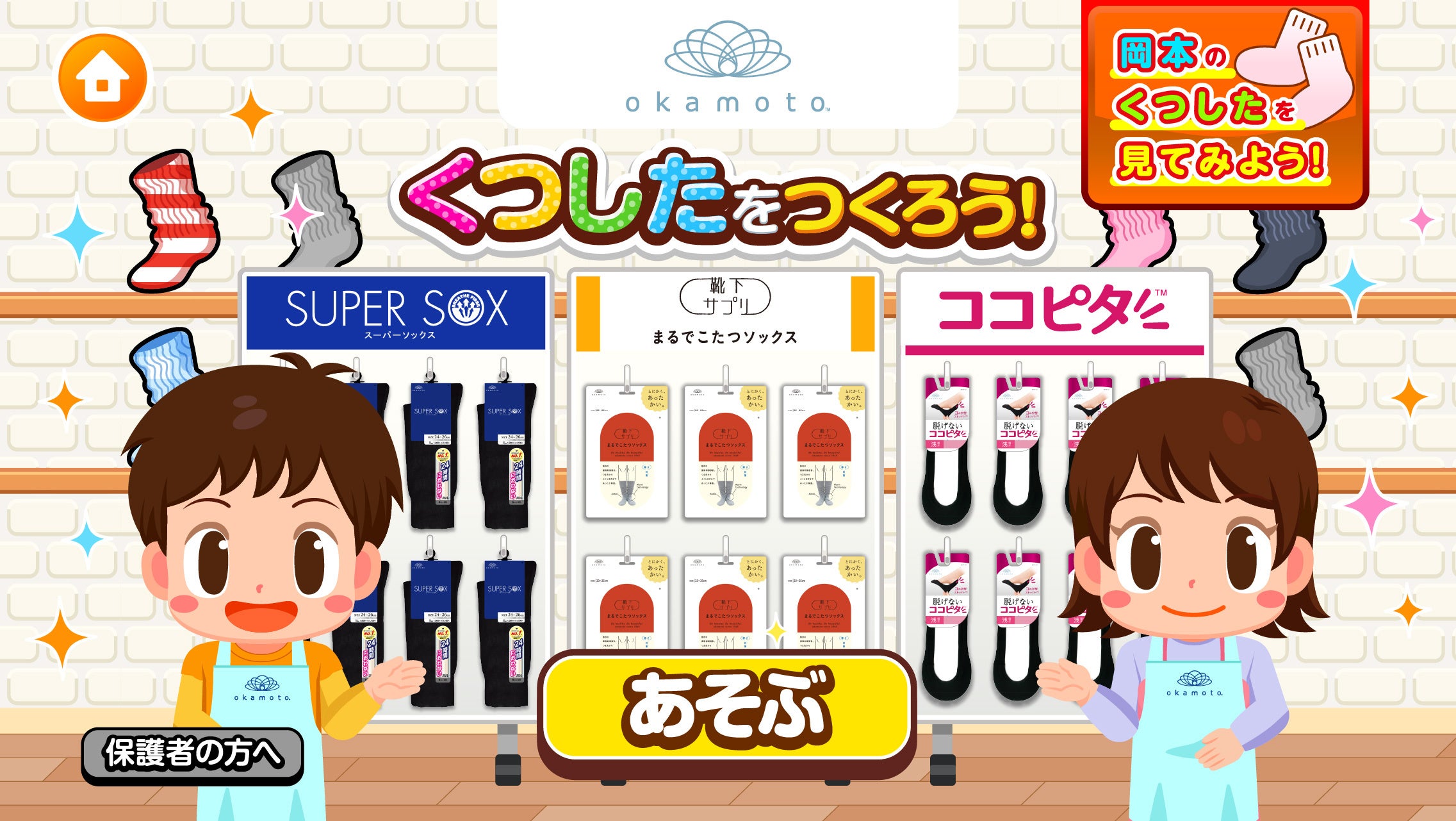 靴下づくりを疑似体験できる「くつしたをつくろう!」と、お客様の悩みに合った靴下を見つける「くつしたをさがそう!」の2つのゲームで構成されています。