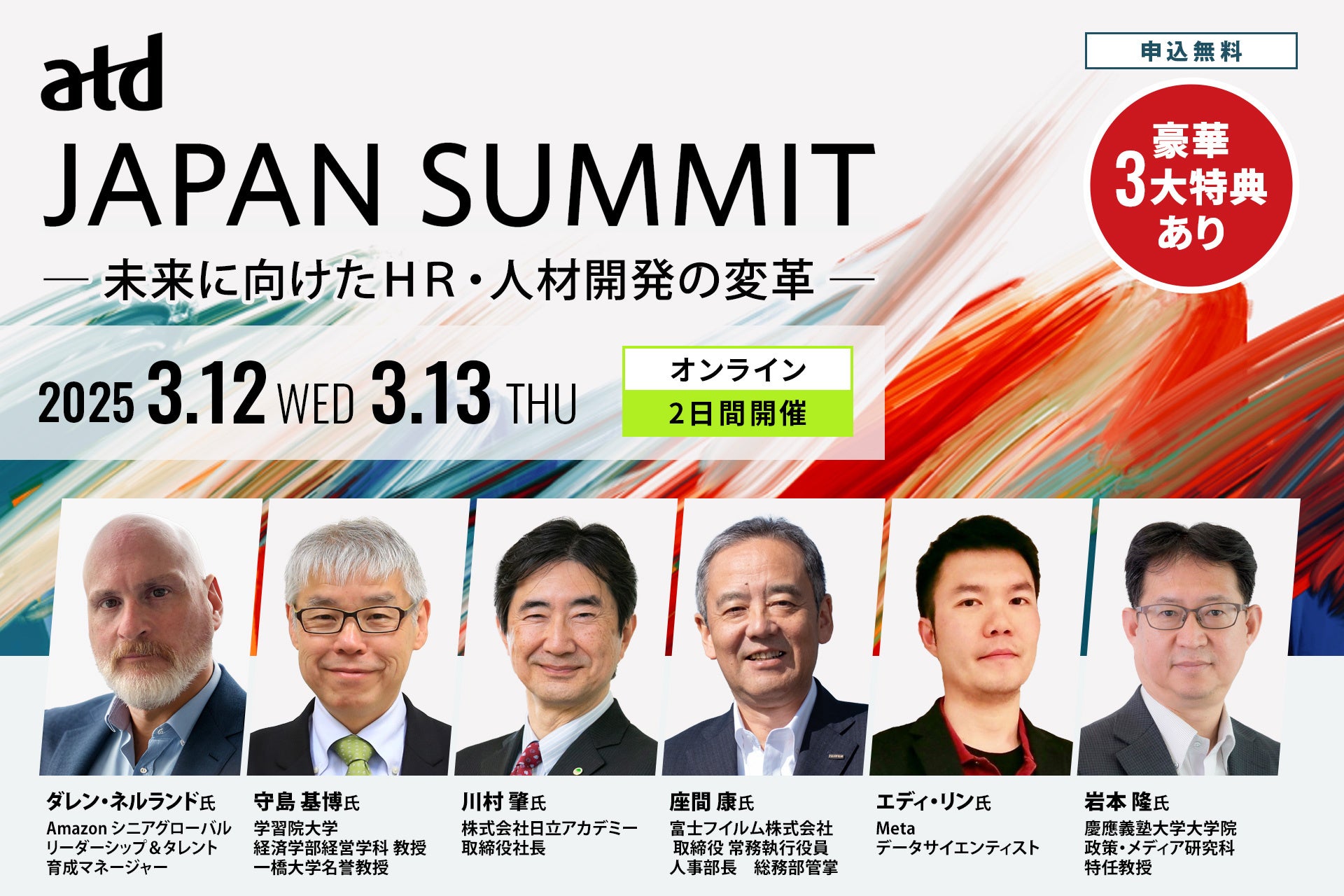 HR、人材開発の領域の世界最先端のさまざまな動向を、ATDがアレンジする複数のスピーカーよりお話しいただくとともに、日本側がこの動向をどう受け止め活かすのか、日本企業が世界で戦う未来のために必要なHRの戦略とはどのようなものなのか、参加の皆さまとともに考えたいと思います。