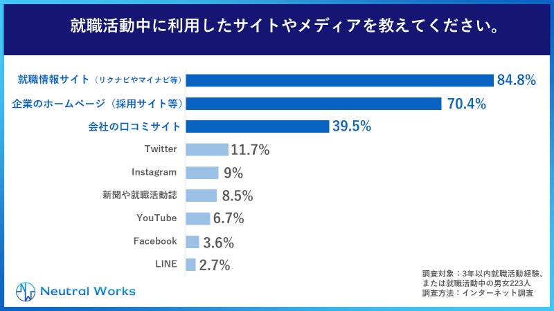 ▶就職活動の情報源:1位「就職情報サイト(約85%)」、2位「企業HP(約70%)」