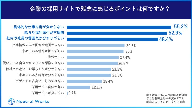 企業の採用サイトで残念に感じるポイント1位は「具体的な仕事内容が分からない(55.2%)」、2位「給与や福利厚生が不透明(52.9%)」、3位「社内や社員の雰囲気が判りづらい(48.4%)」がほぼ同数という結果になりました。
