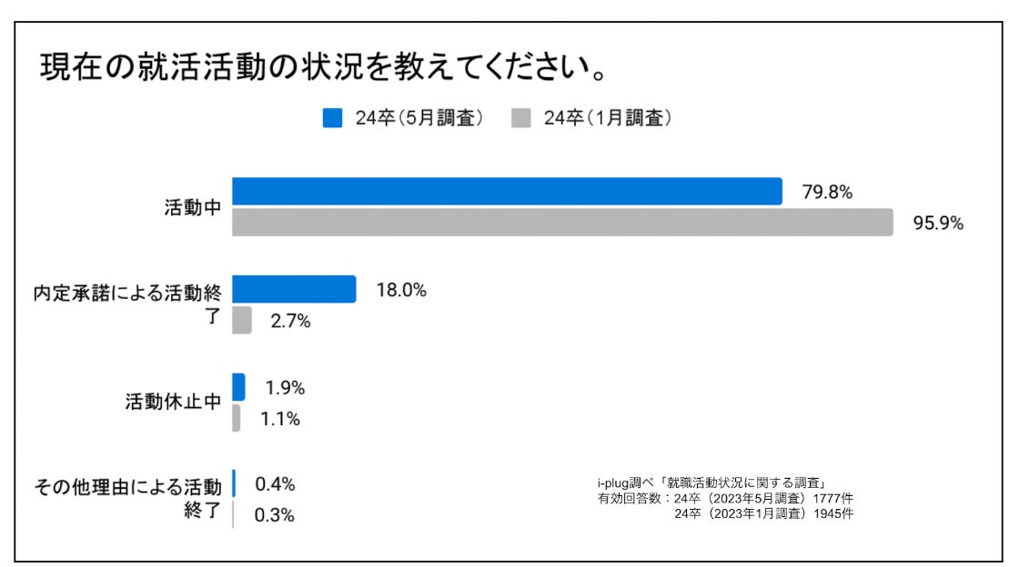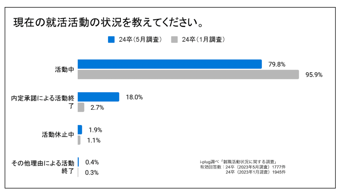 現在の就職活動の状況に関して、回答学生の79.8%が「活動中」と回答しました。同年1月に24卒学生を対象に実施した調査の回答と比較すると、約16ポイント減少。「活動終了」と回答した学生は、約16ポイント増加しました。採用選考活動開始日として政府が提唱する6月を目前にし内定を得るなどして、就職活動を終える学生が増えているようです。