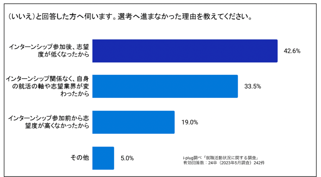 インターンシップへ参加した企業の選考へ進まなかったと回答した理由で最も多かったのは、「インターンシップ参加後、志望度が低くなったから」でした。Q4の結果のように、インターンシップの参加が志望度に良い影響を与える一方で、志望度の低下にも影響があるようです。