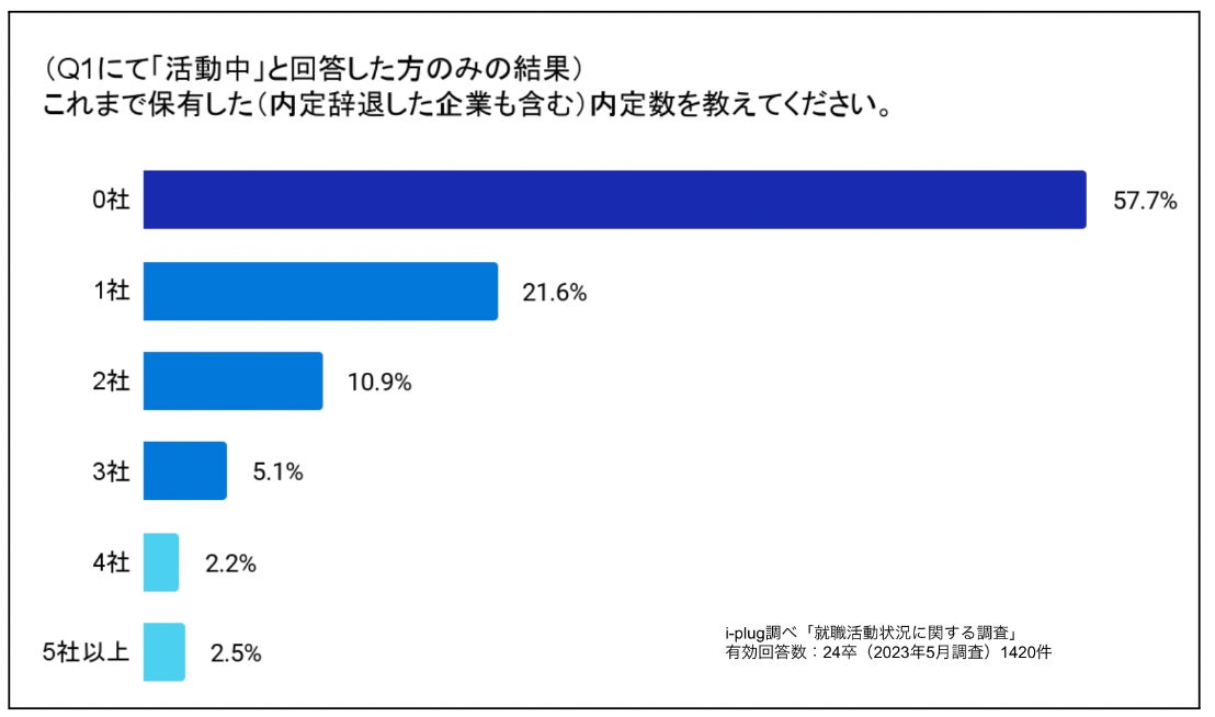 内定を保有する社数をQ1にて「活動中」と回答した方のみの結果で見ると、42.3%の学生が1社以上の内定を保有しながらも就職活動を続けていることがわかりました。