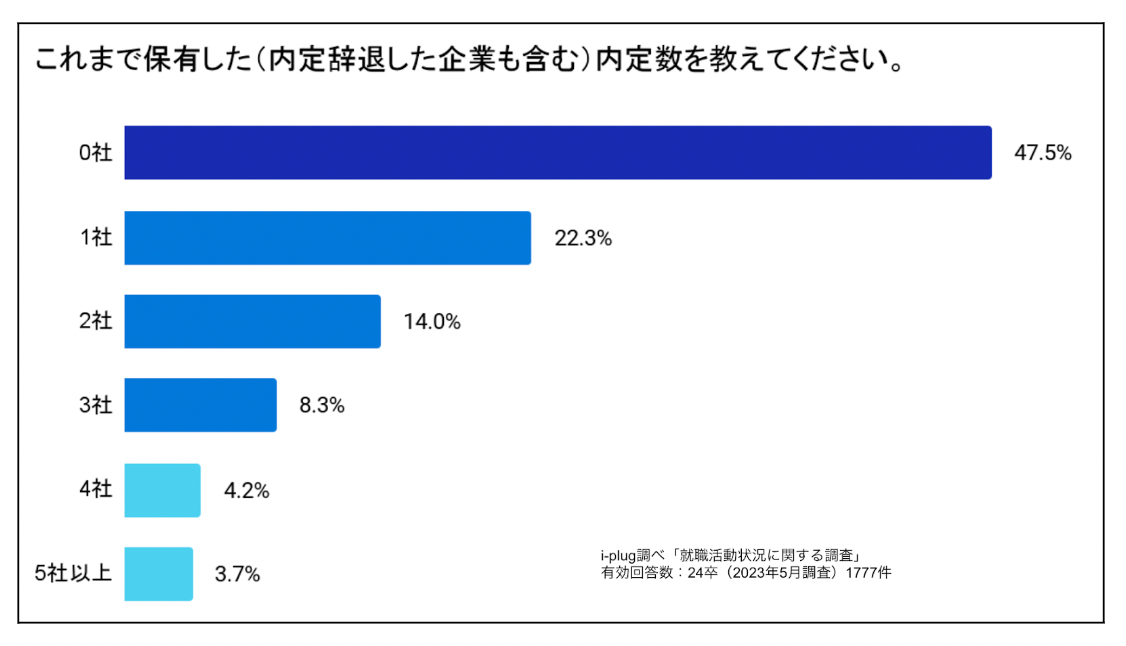 「0社」が最多の47.5%でした。一方で半数以上の学生がすでに1社以上の内定を保有しています。